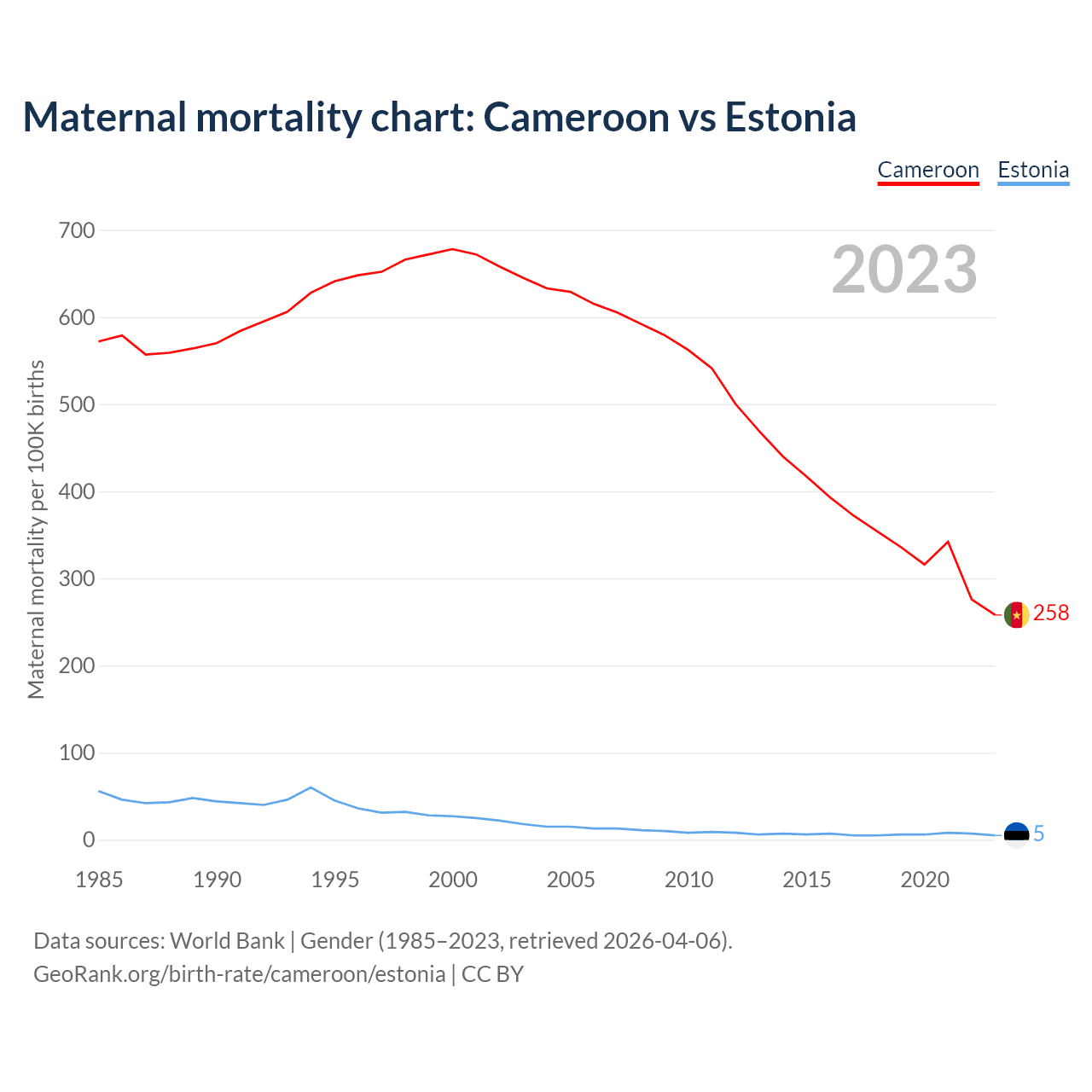 The maternal mortality rate, which is the probability of dying during childbirth or within 42 days of pregnancy termination, is 258 deaths per 100,000 live births in Cameroon, compared to 5 deaths in Estonia.