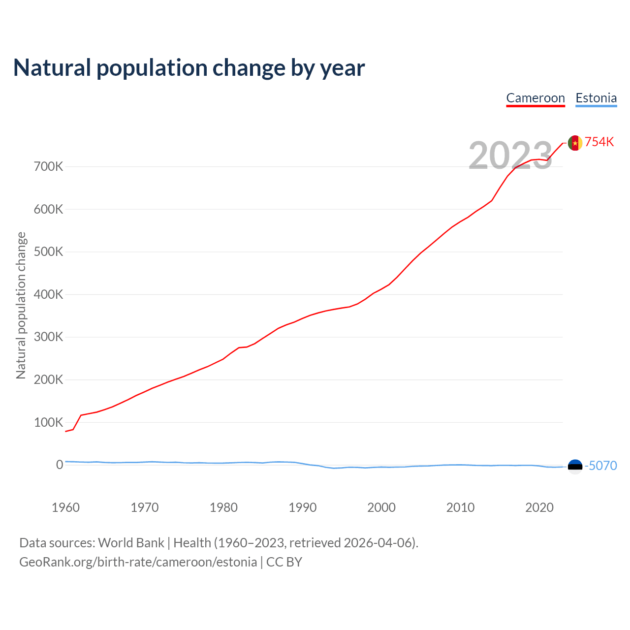 According to the latest available data on birth rates, the fertility rate in Cameroon was 4.32 children per woman in 2023, compared to 1.31 in Estonia in 2023. The replacement level is considered to be 2.1 children per woman.