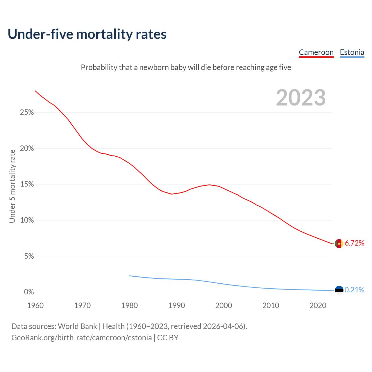 The chance that a newborn baby will die before reaching age five is 6.72% in Cameroon and 0.21% in Estonia. Above is a chart with historical data on under-five mortality rates.