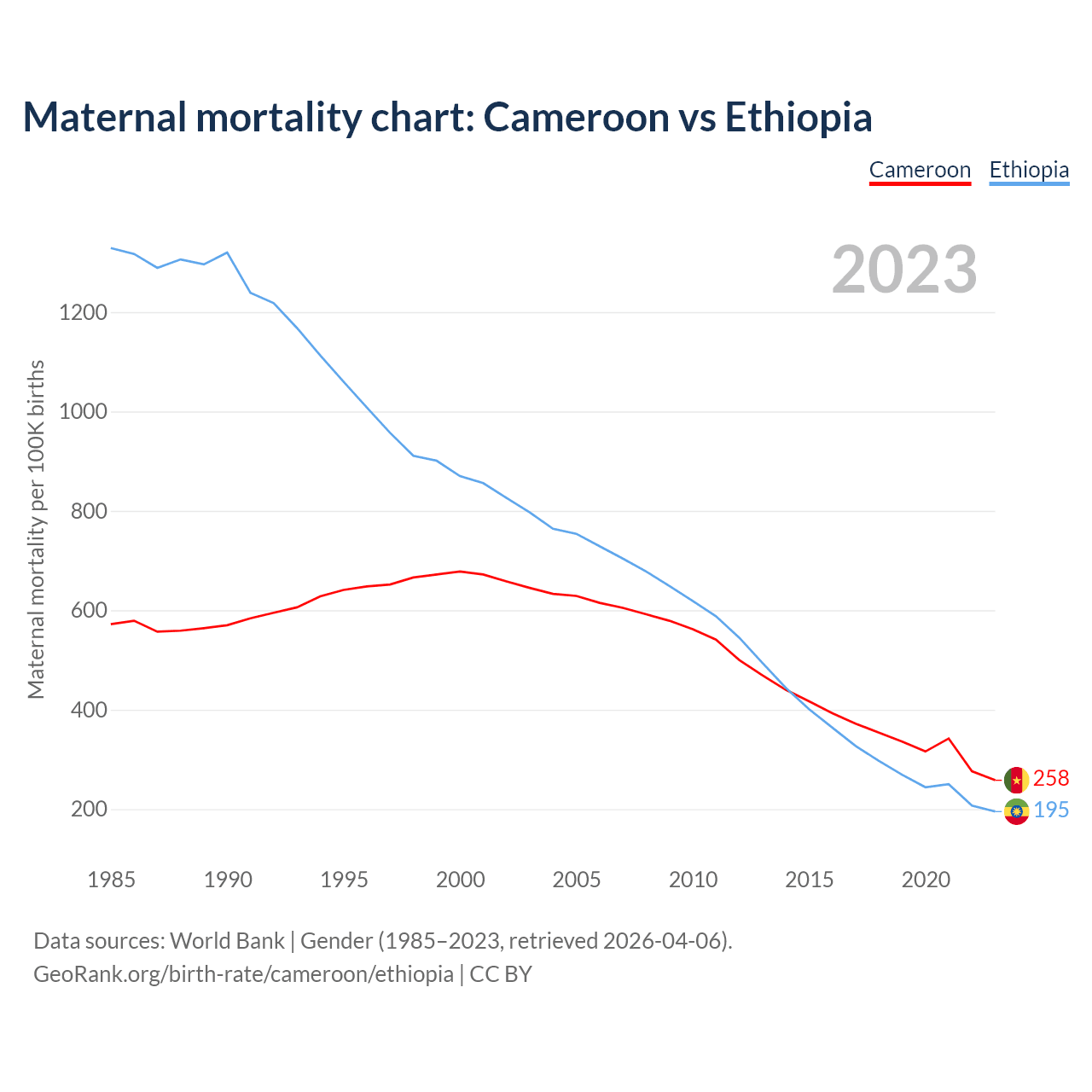 The maternal mortality rate, which is the probability of dying during childbirth or within 42 days of pregnancy termination, is 258 deaths per 100,000 live births in Cameroon, compared to 195 deaths in Ethiopia.
