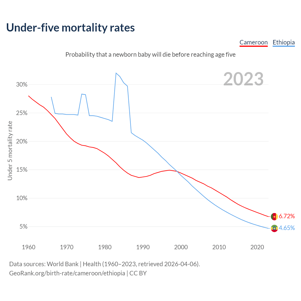 The chance that a newborn baby will die before reaching age five is 6.72% in Cameroon and 4.65% in Ethiopia. Above is a chart with historical data on under-five mortality rates.