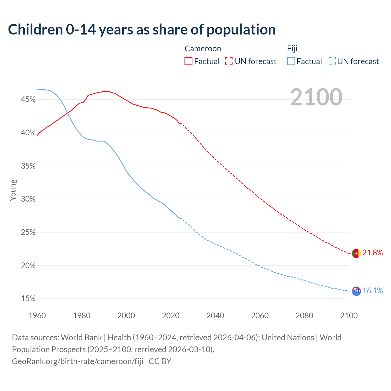 Cameroon has an annual birth rate of 33.7 births per 1,000 people, compared to 18 for Fiji. The average number of children a woman is expected to have during her lifetime — the fertility rate, is 4.32 in Cameroon and 2.28 in Fiji — 47.2% difference.
