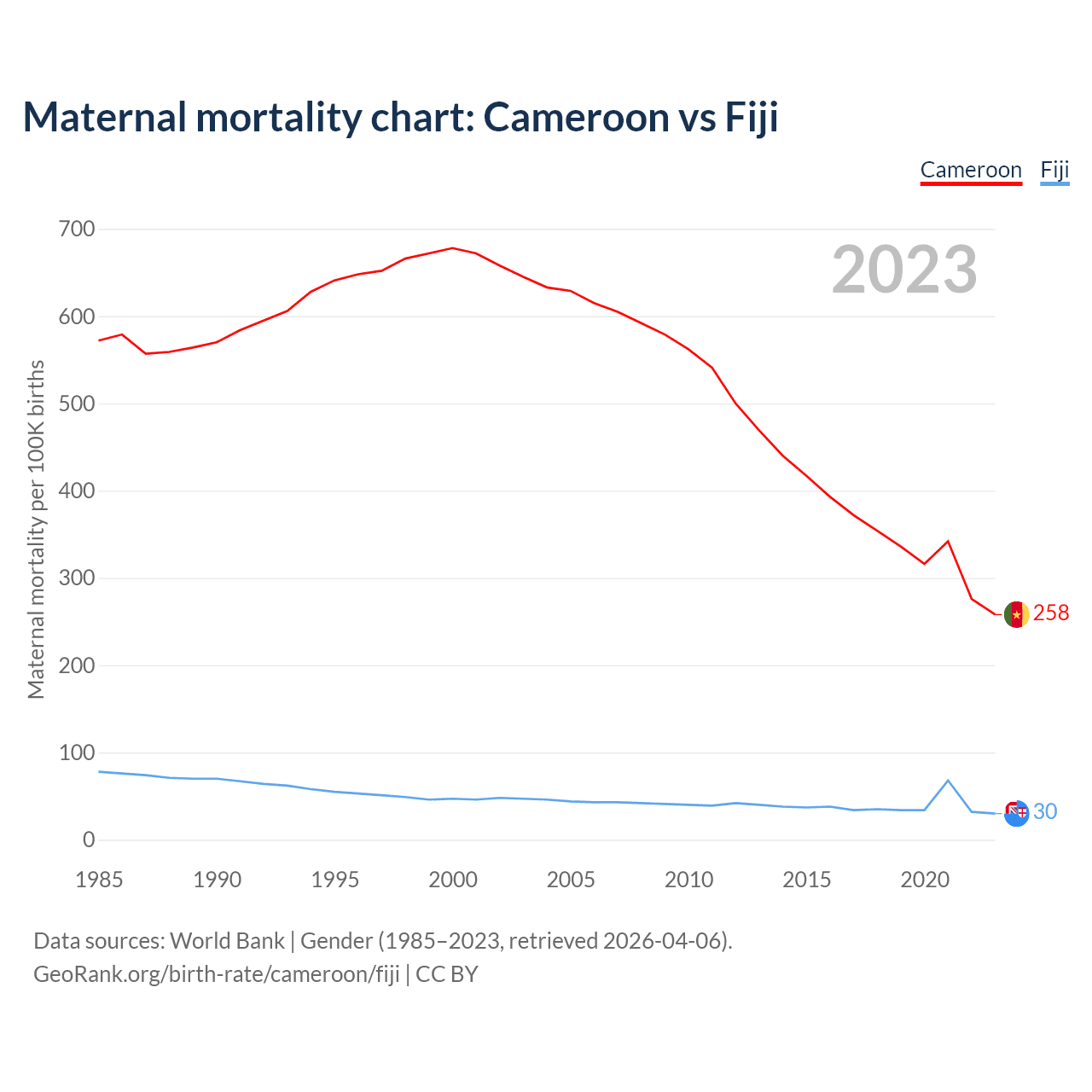 The maternal mortality rate, which is the probability of dying during childbirth or within 42 days of pregnancy termination, is 258 deaths per 100,000 live births in Cameroon, compared to 30 deaths in Fiji.