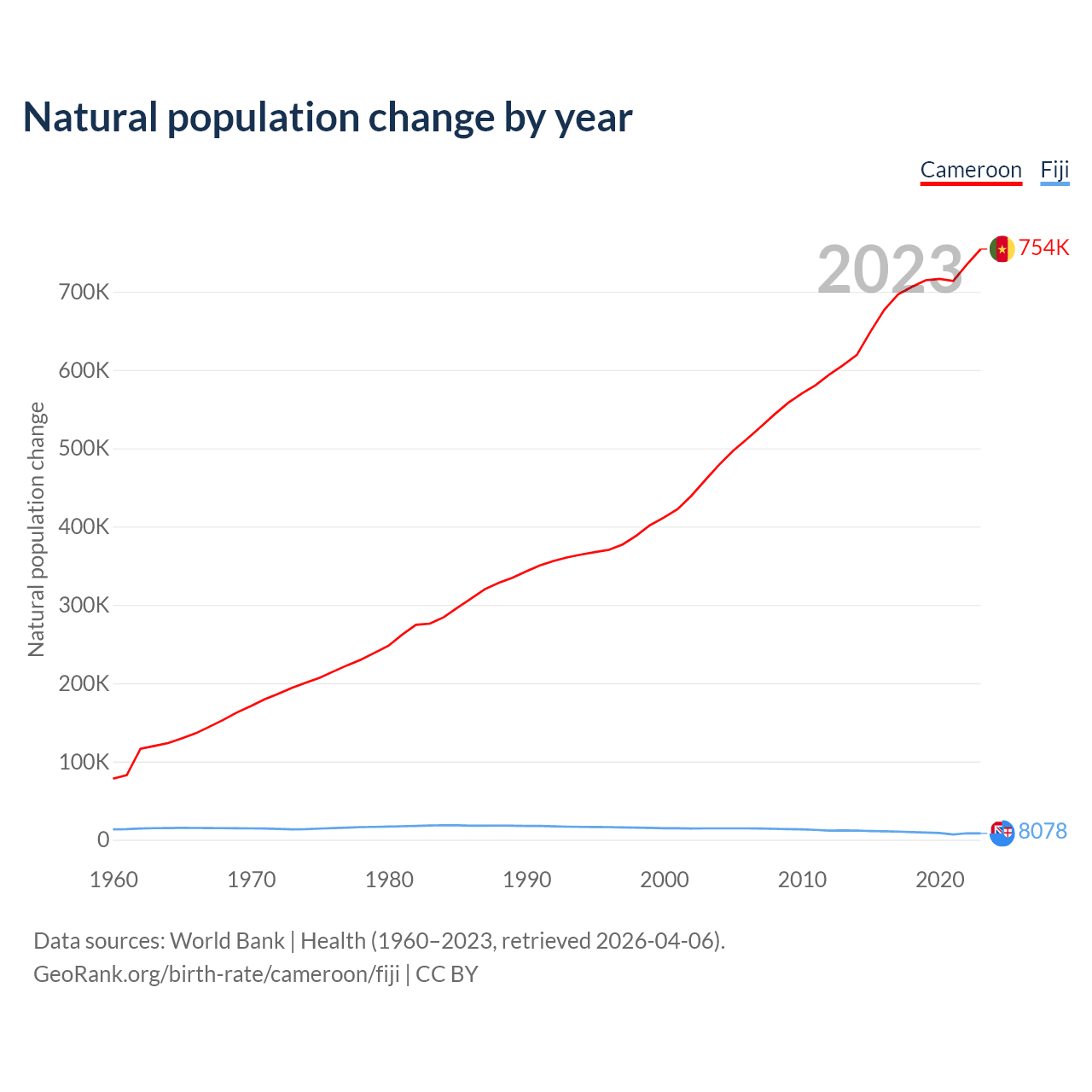 According to the latest available data on birth rates, the fertility rate in Cameroon was 4.32 children per woman in 2023, compared to 2.28 in Fiji in 2023. The replacement level is considered to be 2.1 children per woman.