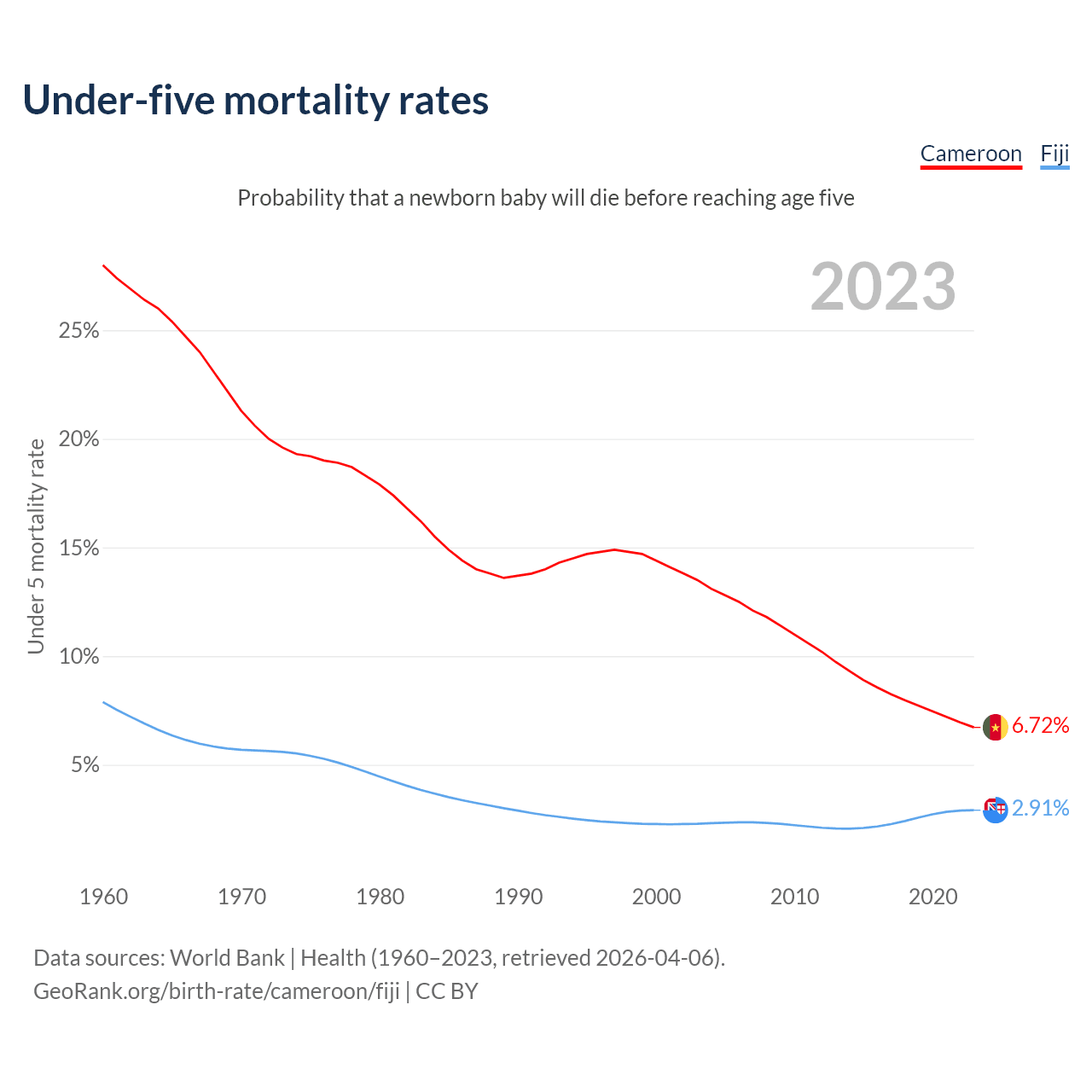 The chance that a newborn baby will die before reaching age five is 6.72% in Cameroon and 2.91% in Fiji. Above is a chart with historical data on under-five mortality rates.