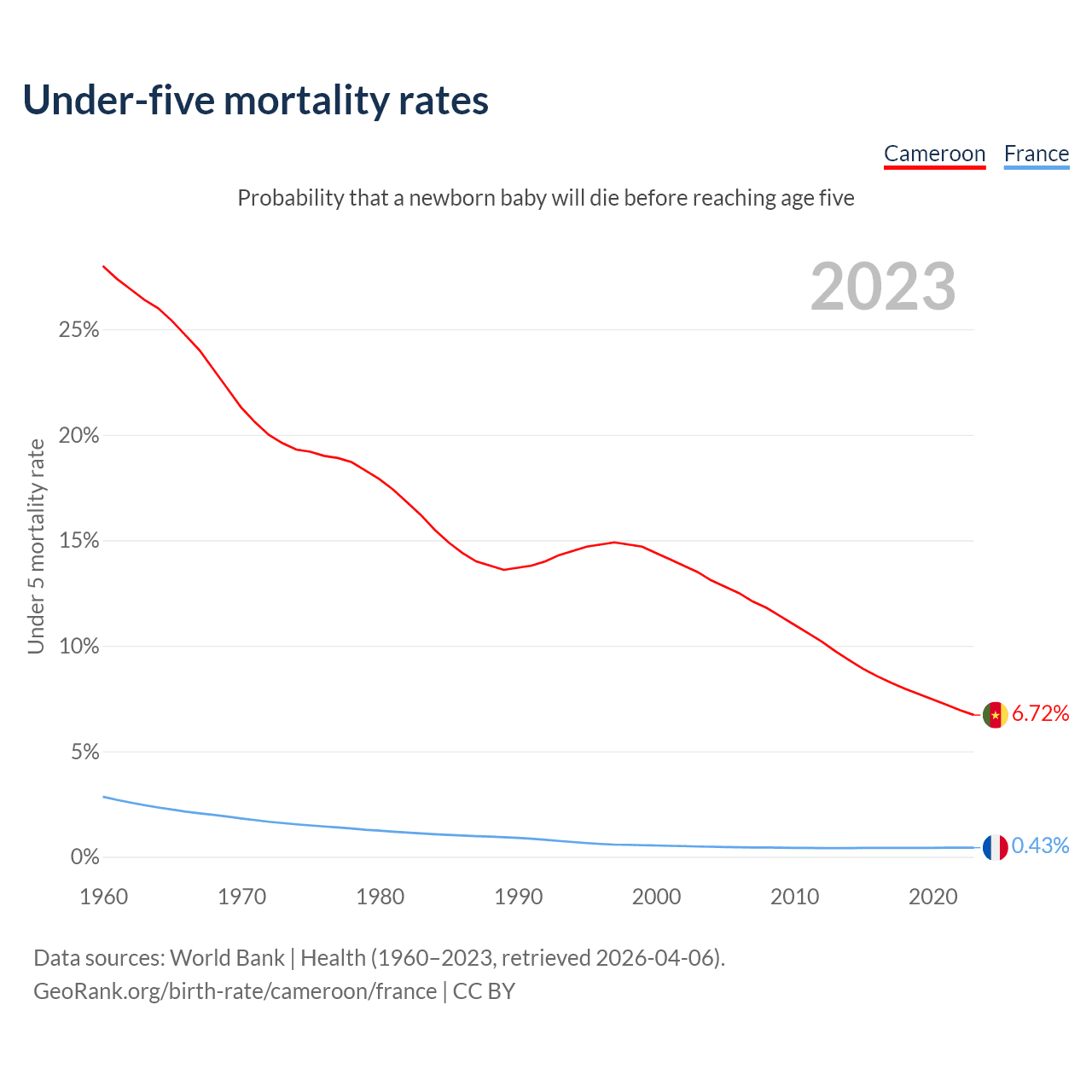 The chance that a newborn baby will die before reaching age five is 6.72% in Cameroon and 0.43% in France. Above is a chart with historical data on under-five mortality rates.