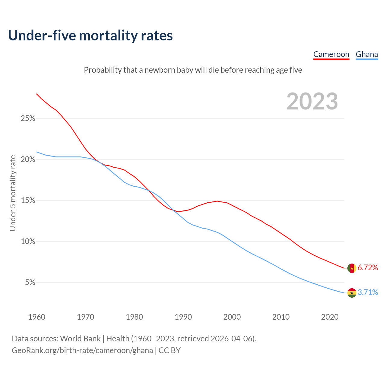 The chance that a newborn baby will die before reaching age five is 6.72% in Cameroon and 3.71% in Ghana. Above is a chart with historical data on under-five mortality rates.