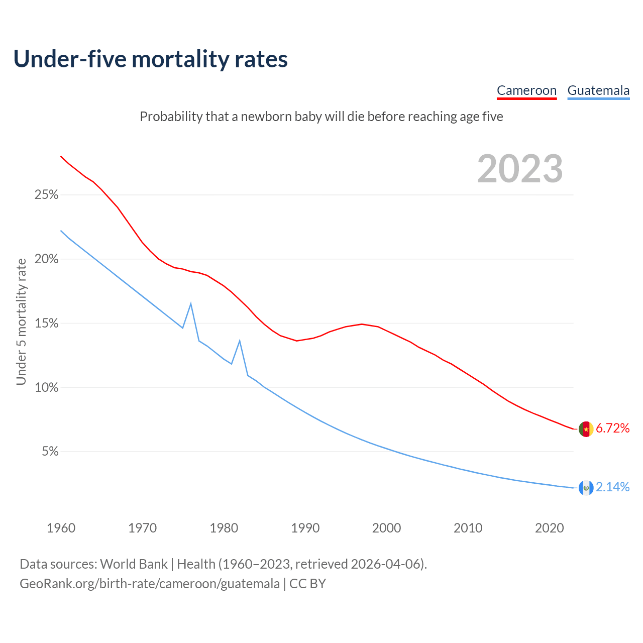 The chance that a newborn baby will die before reaching age five is 6.72% in Cameroon and 2.14% in Guatemala. Above is a chart with historical data on under-five mortality rates.