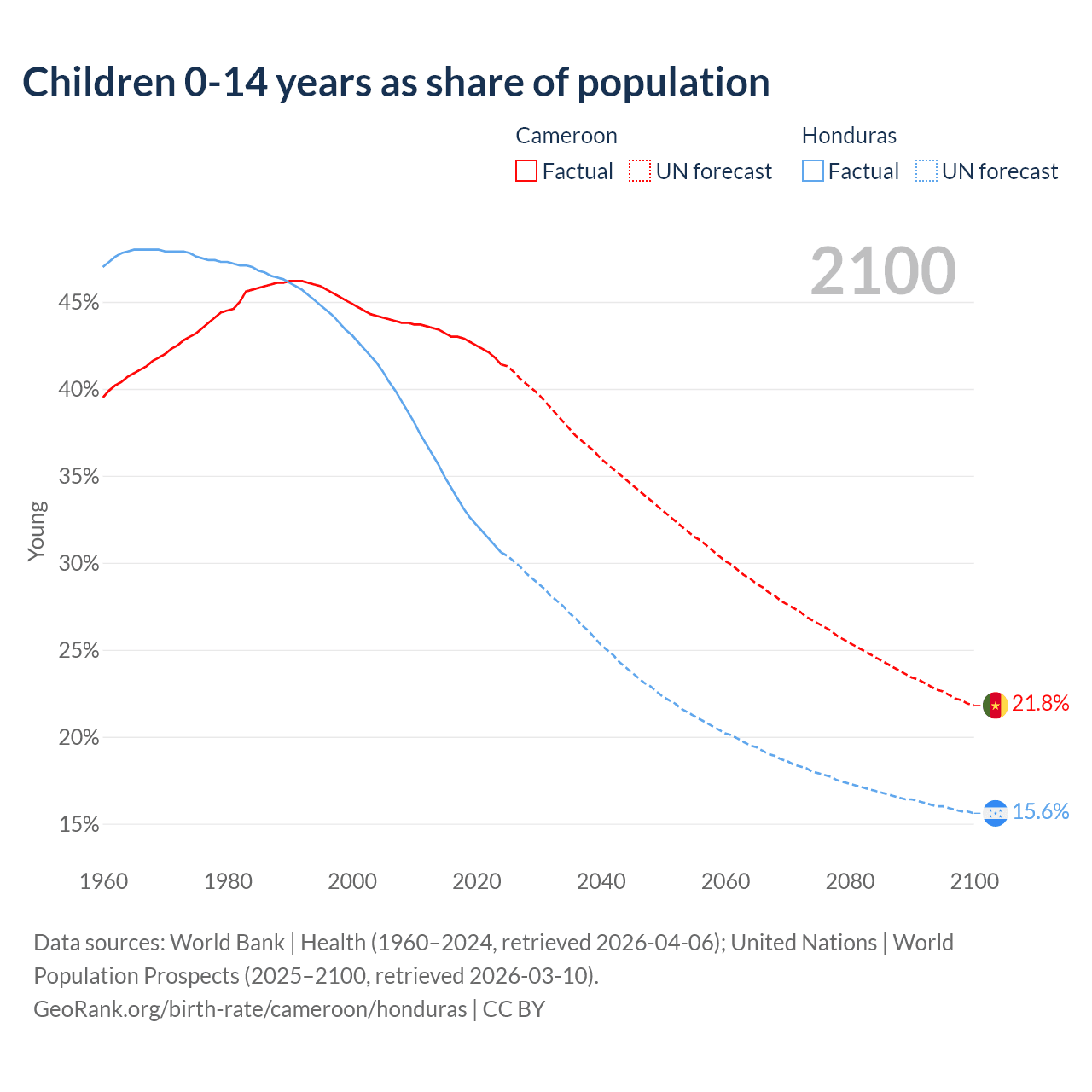According to the latest available data on birth rates, the fertility rate in Cameroon was 4.32 children per woman in 2023, compared to 2.5 in Honduras in 2023. The replacement level is considered to be 2.1 children per woman.