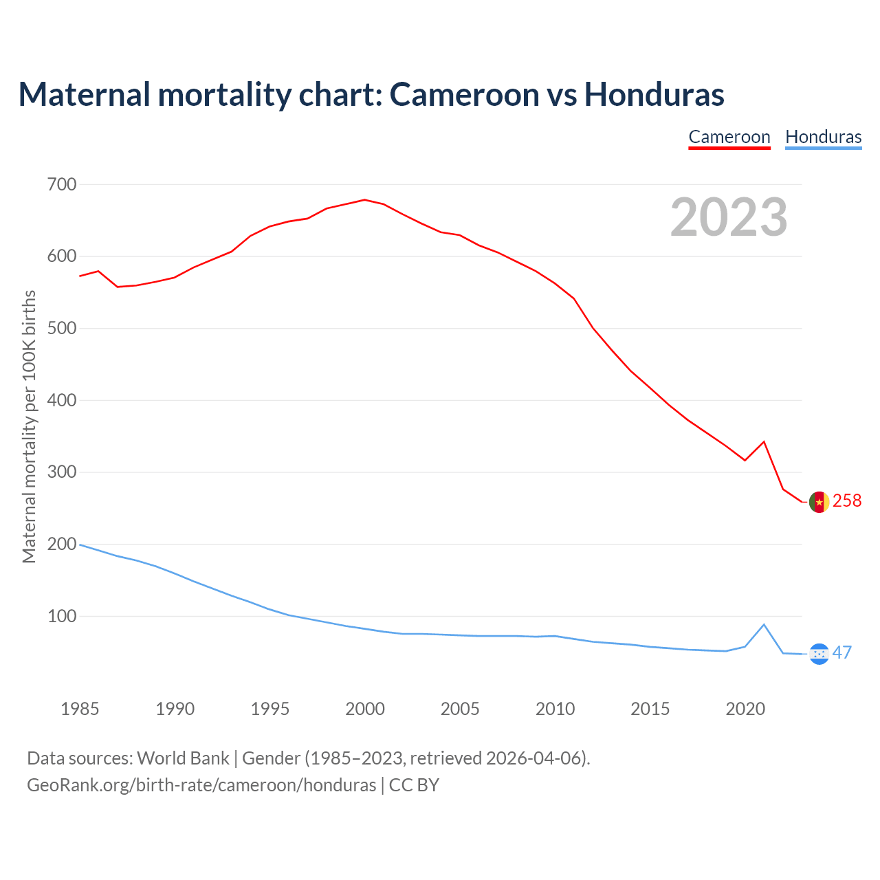 The maternal mortality rate, which is the probability of dying during childbirth or within 42 days of pregnancy termination, is 258 deaths per 100,000 live births in Cameroon, compared to 47 deaths in Honduras.