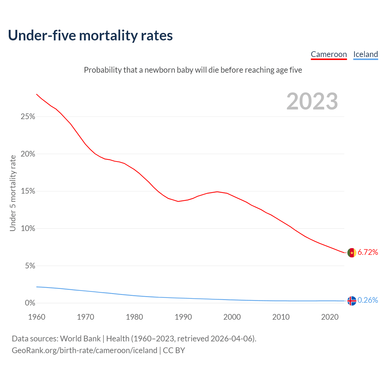 The chance that a newborn baby will die before reaching age five is 6.72% in Cameroon and 0.26% in Iceland. Above is a chart with historical data on under-five mortality rates.