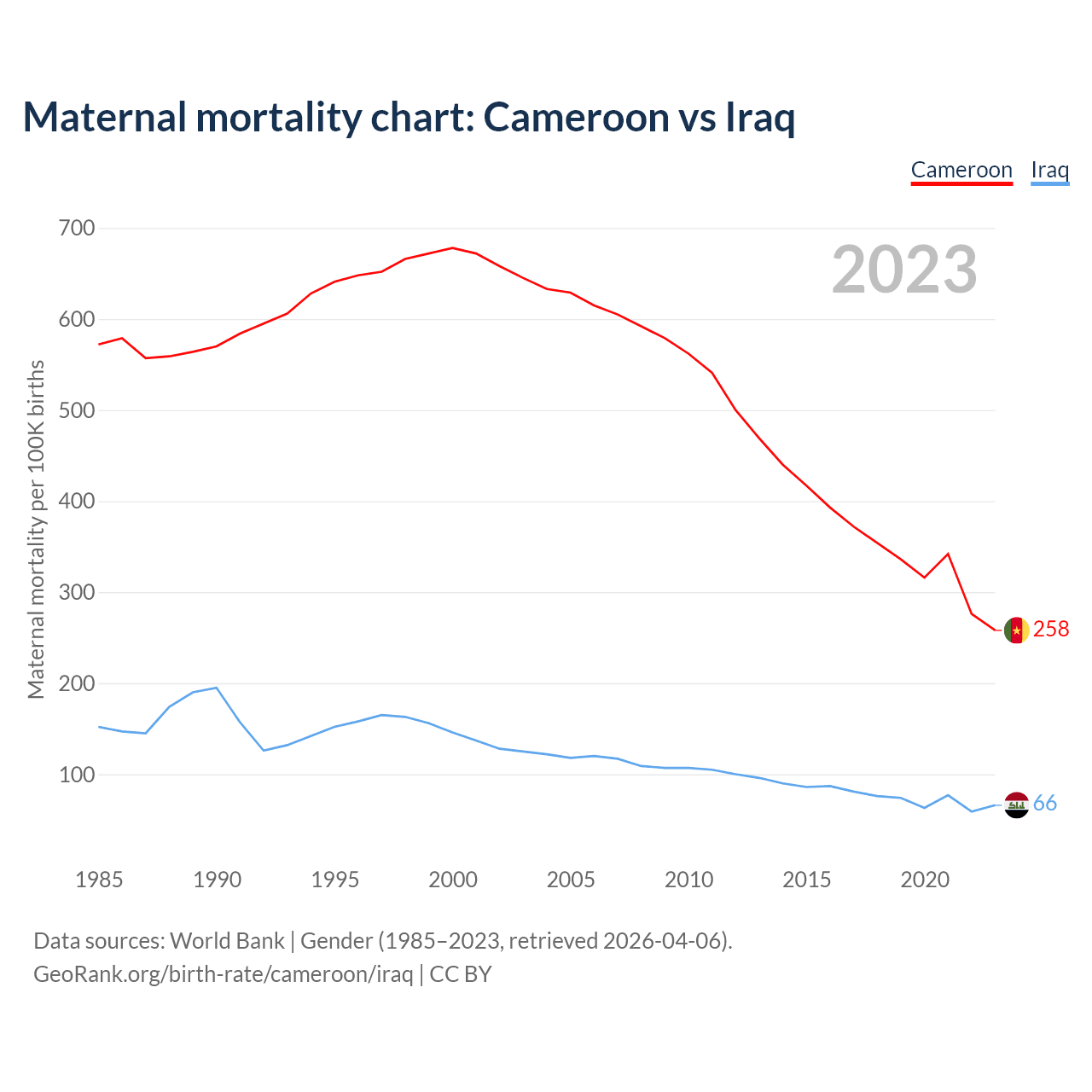 The maternal mortality rate, which is the probability of dying during childbirth or within 42 days of pregnancy termination, is 258 deaths per 100,000 live births in Cameroon, compared to 66 deaths in Iraq.