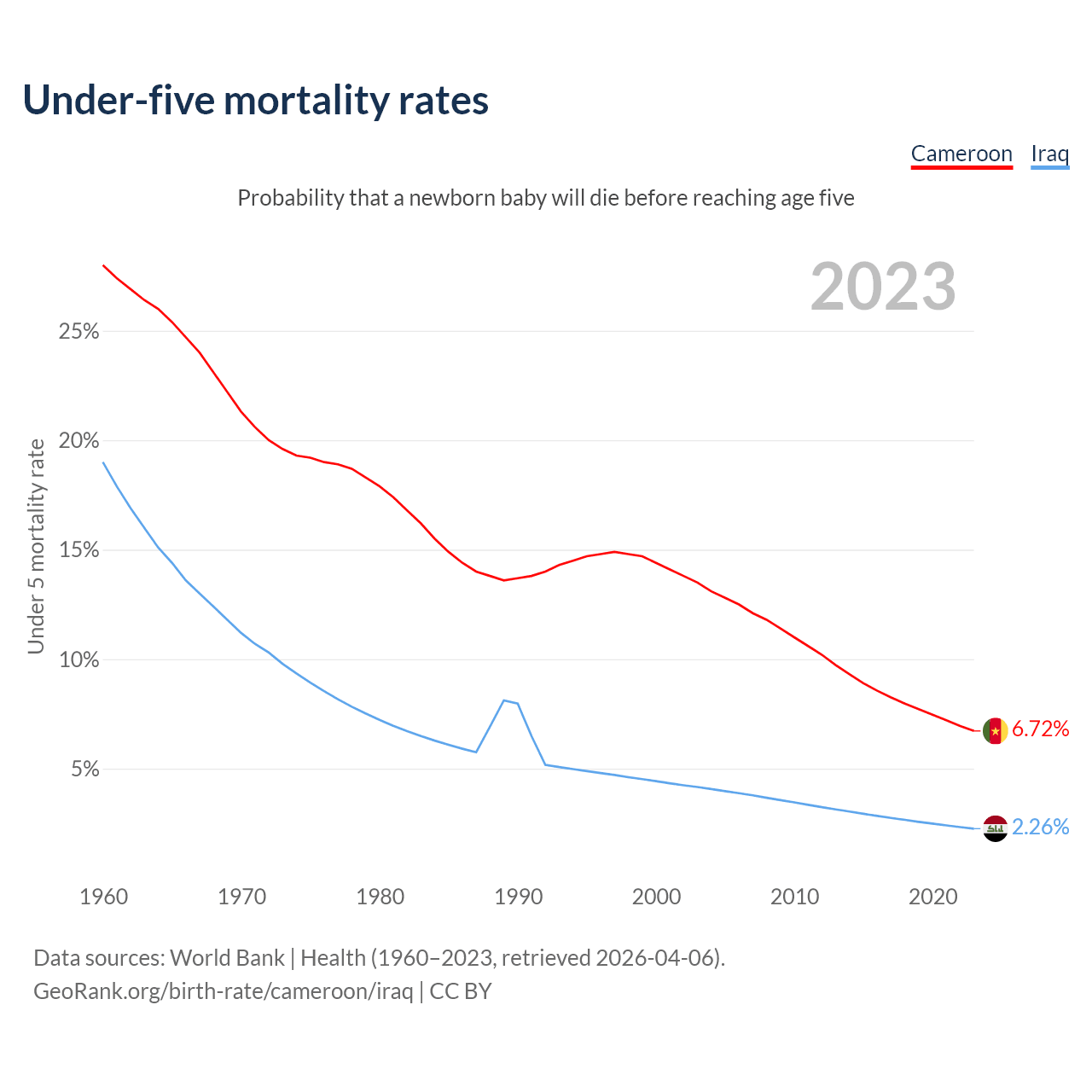 The chance that a newborn baby will die before reaching age five is 6.72% in Cameroon and 2.26% in Iraq. Above is a chart with historical data on under-five mortality rates.