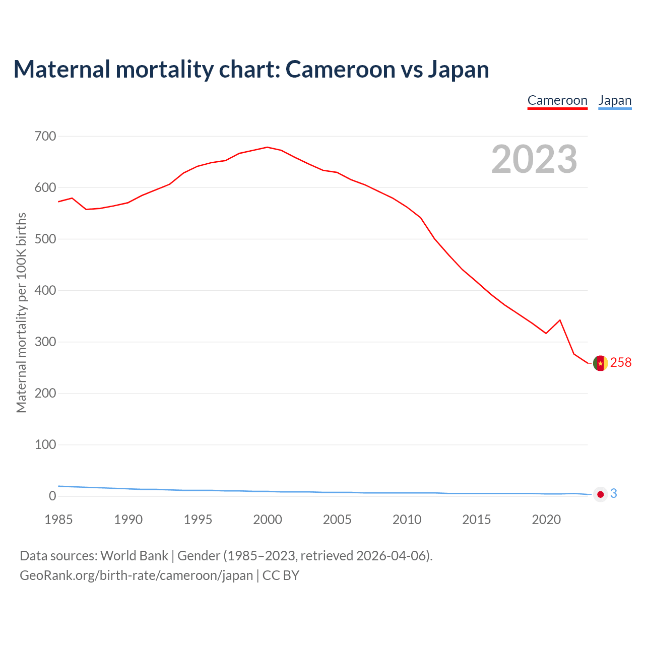 The maternal mortality rate, which is the probability of dying during childbirth or within 42 days of pregnancy termination, is 258 deaths per 100,000 live births in Cameroon, compared to 3 deaths in Japan.