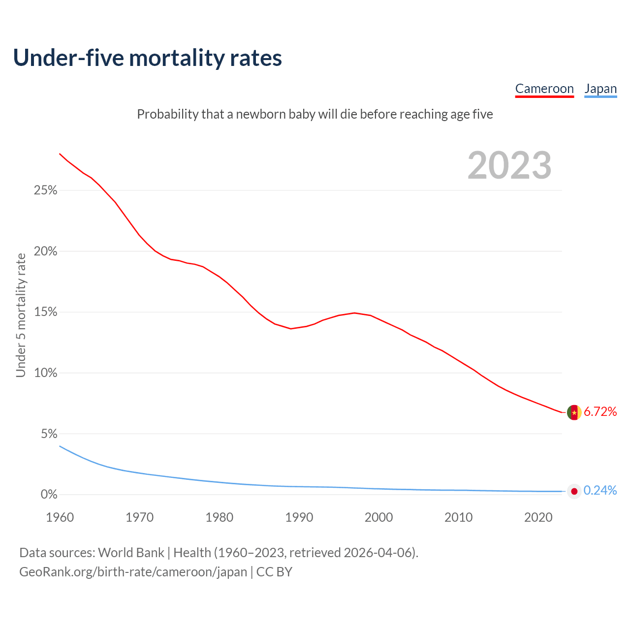 The chance that a newborn baby will die before reaching age five is 6.72% in Cameroon and 0.24% in Japan. Above is a chart with historical data on under-five mortality rates.