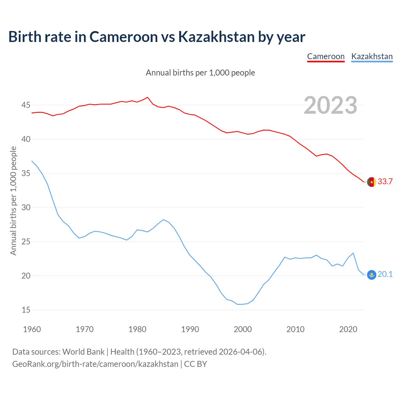 Cameroon has an annual birth rate of 33.7 births per 1,000 people, compared to 20.1 for Kazakhstan. The average number of children a woman is expected to have during her lifetime — the fertility rate, is 4.32 in Cameroon and 3.01 in Kazakhstan — 30.3% difference.