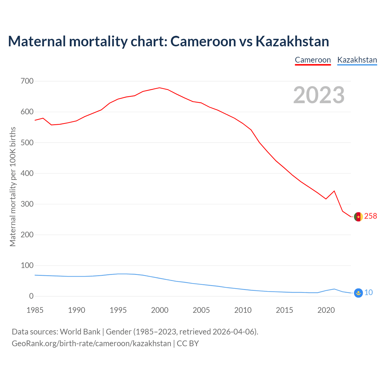 The maternal mortality rate, which is the probability of dying during childbirth or within 42 days of pregnancy termination, is 258 deaths per 100,000 live births in Cameroon, compared to 10 deaths in Kazakhstan.