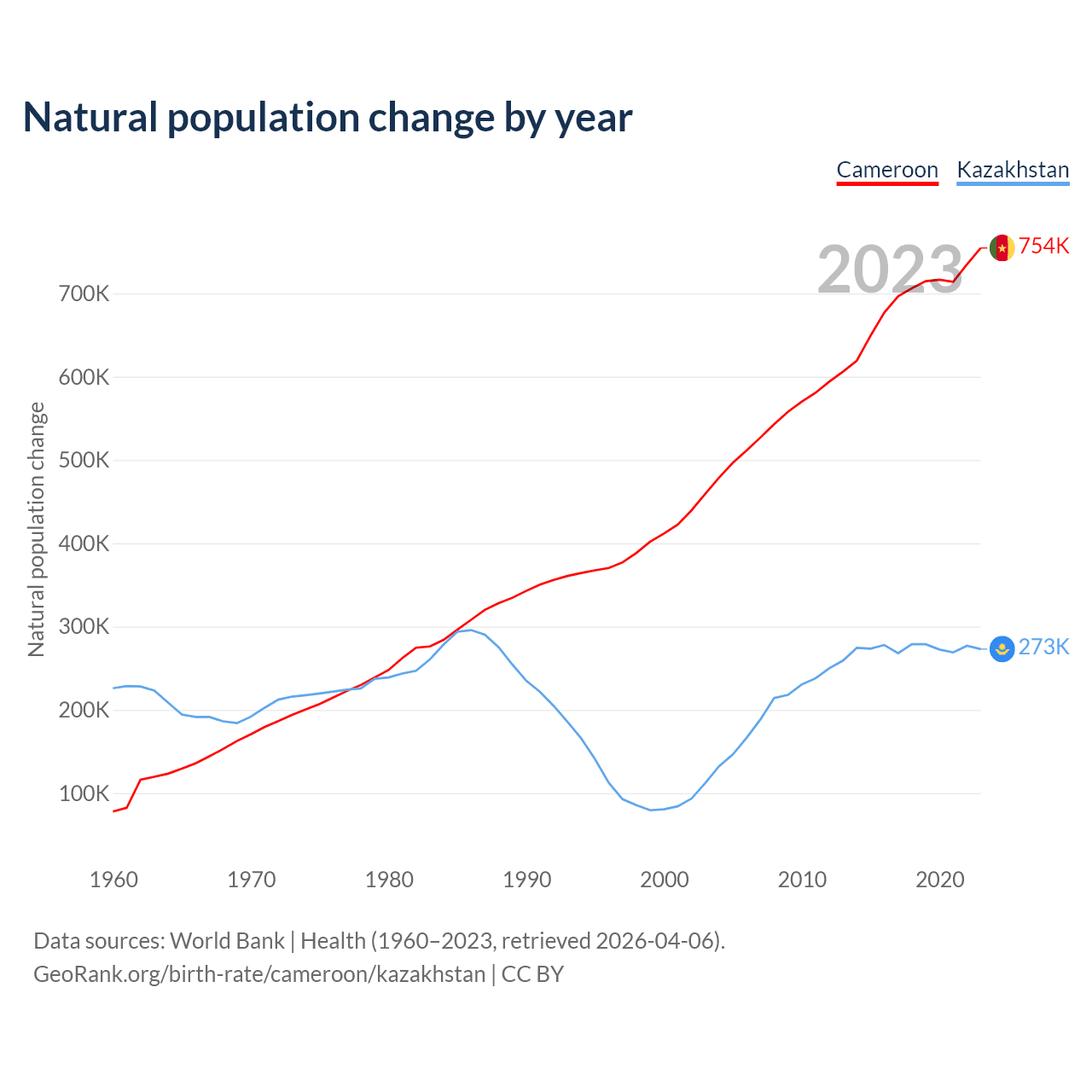 According to the latest available data on birth rates, the fertility rate in Cameroon was 4.32 children per woman in 2023, compared to 3.01 in Kazakhstan in 2023. The replacement level is considered to be 2.1 children per woman.
