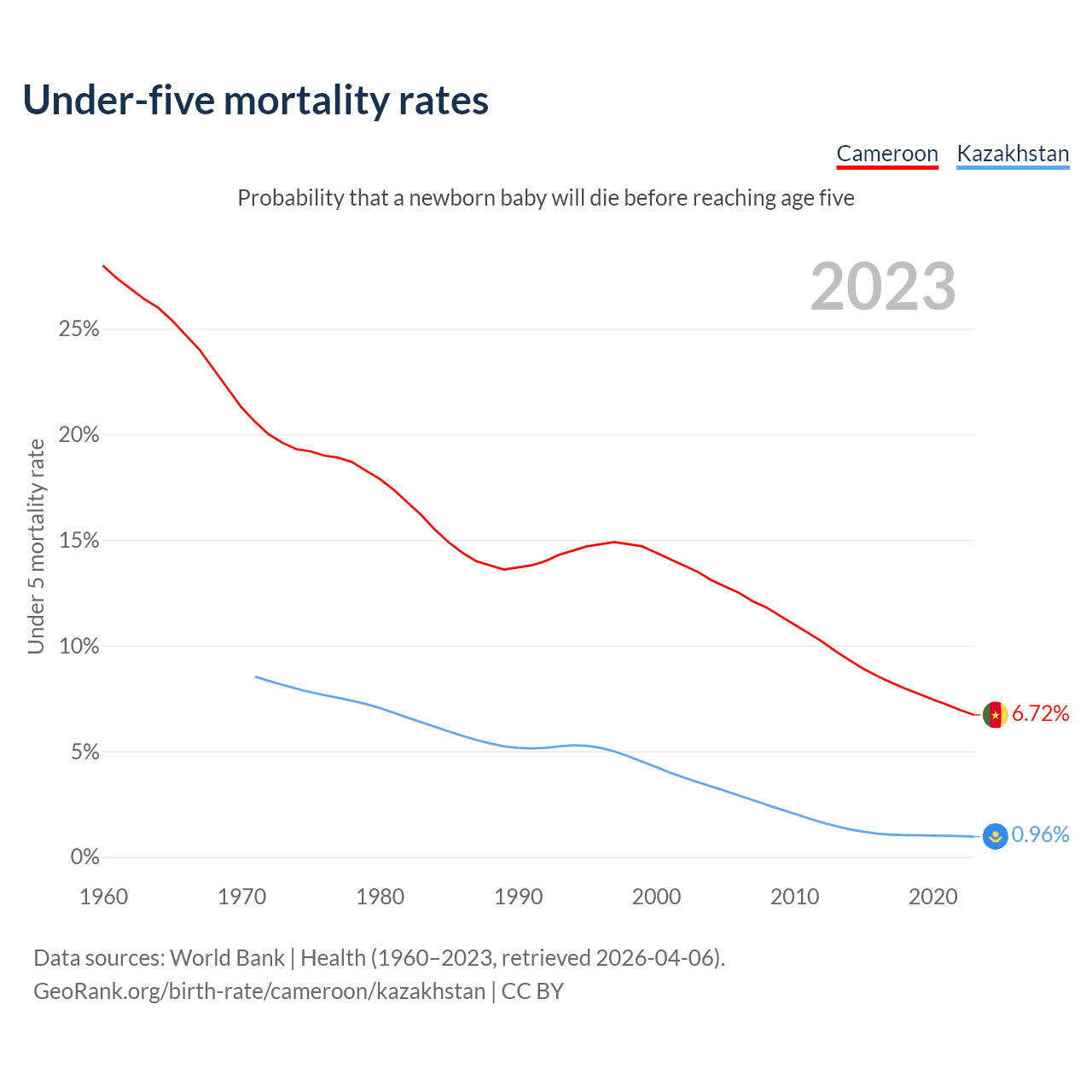 The chance that a newborn baby will die before reaching age five is 6.72% in Cameroon and 0.96% in Kazakhstan. Above is a chart with historical data on under-five mortality rates.
