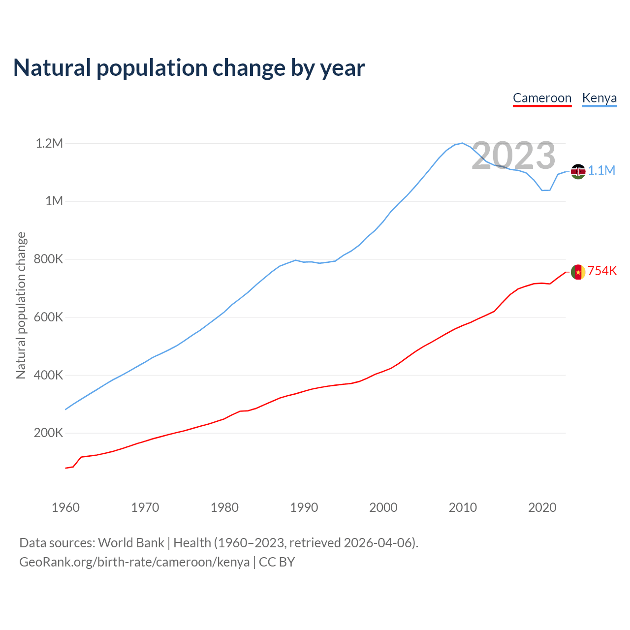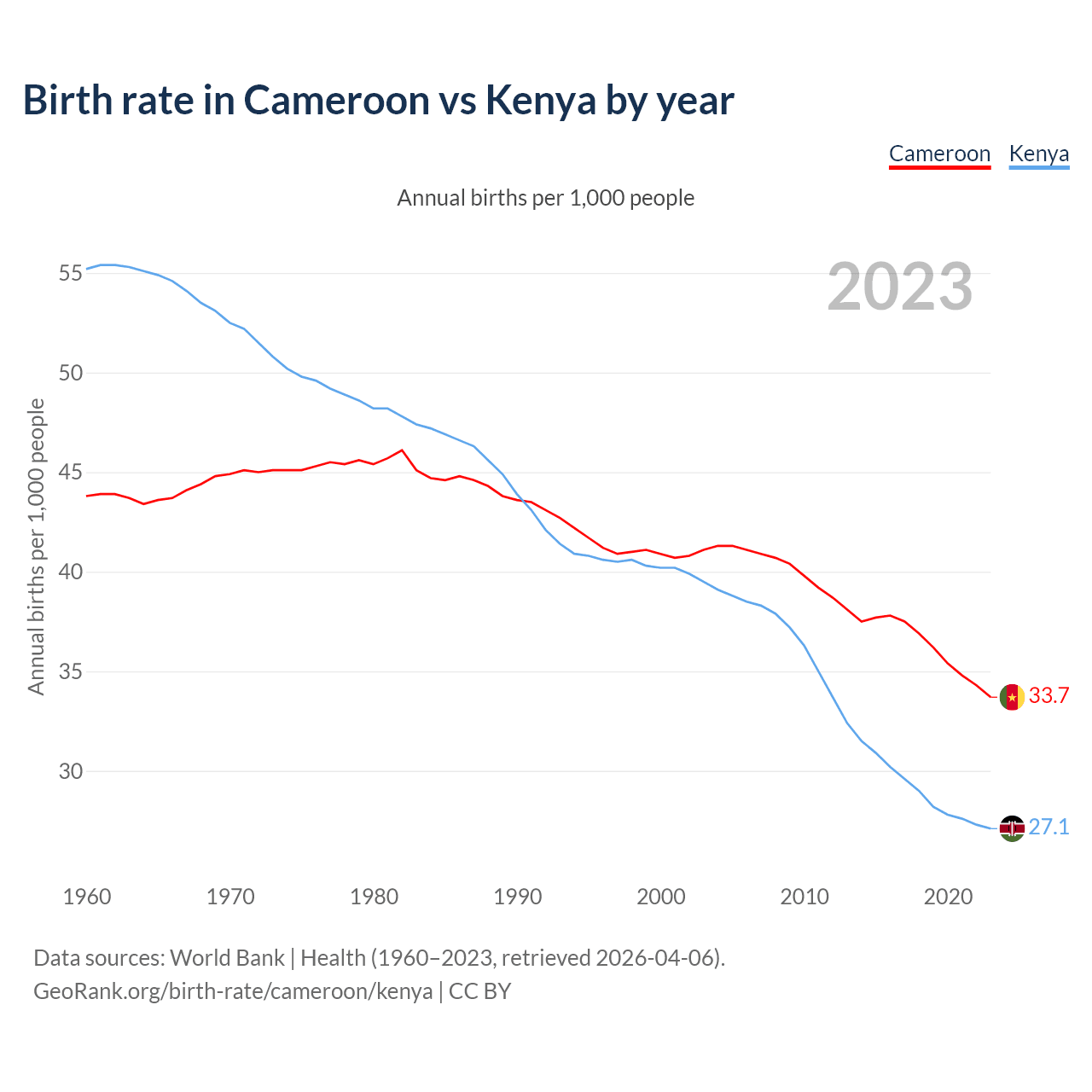 According to the latest available data on birth rates, the fertility rate in Cameroon was 4.32 children per woman in 2023, compared to 3.21 in Kenya in 2023. The replacement level is considered to be 2.1 children per woman.