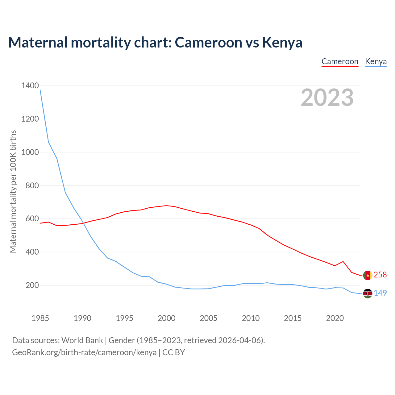 The maternal mortality rate, which is the probability of dying during childbirth or within 42 days of pregnancy termination, is 258 deaths per 100,000 live births in Cameroon, compared to 149 deaths in Kenya.