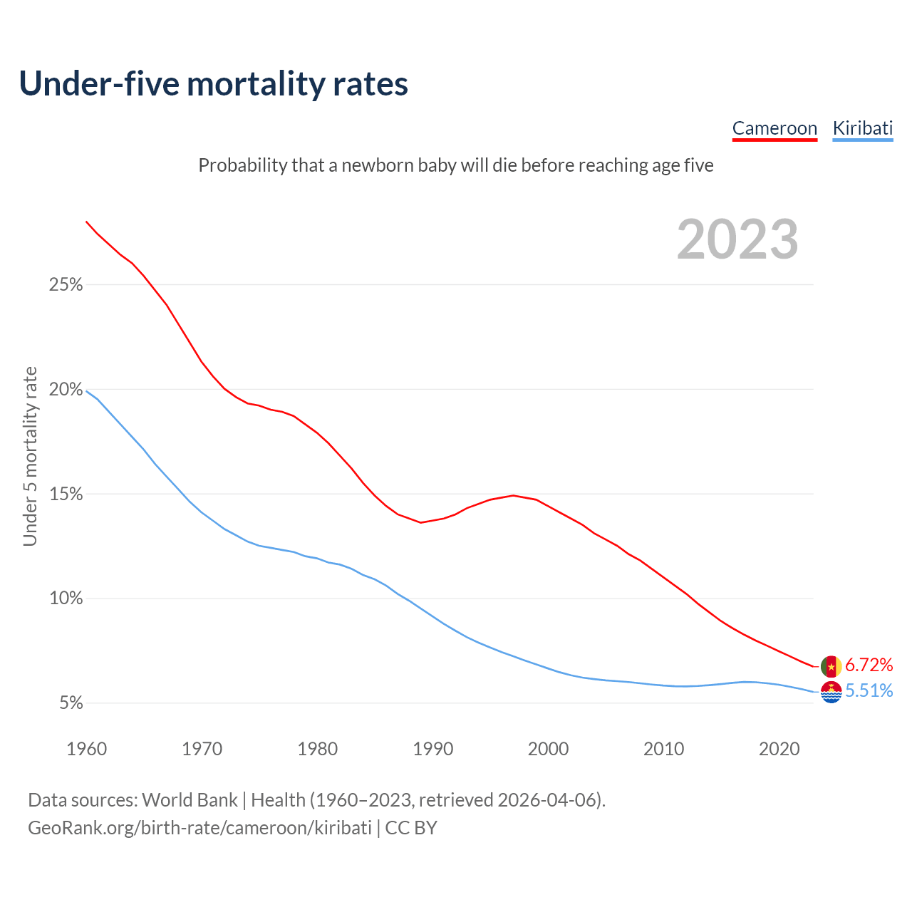 The chance that a newborn baby will die before reaching age five is 6.72% in Cameroon and 5.51% in Kiribati. Above is a chart with historical data on under-five mortality rates.