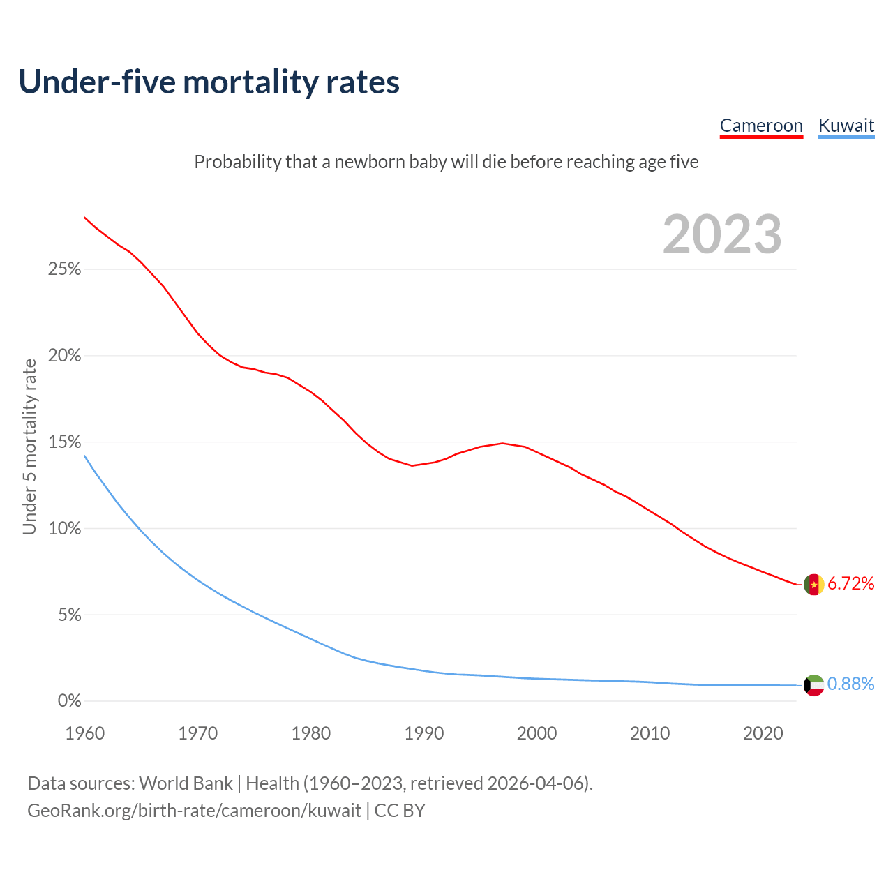 The chance that a newborn baby will die before reaching age five is 6.72% in Cameroon and 0.88% in Kuwait. Above is a chart with historical data on under-five mortality rates.