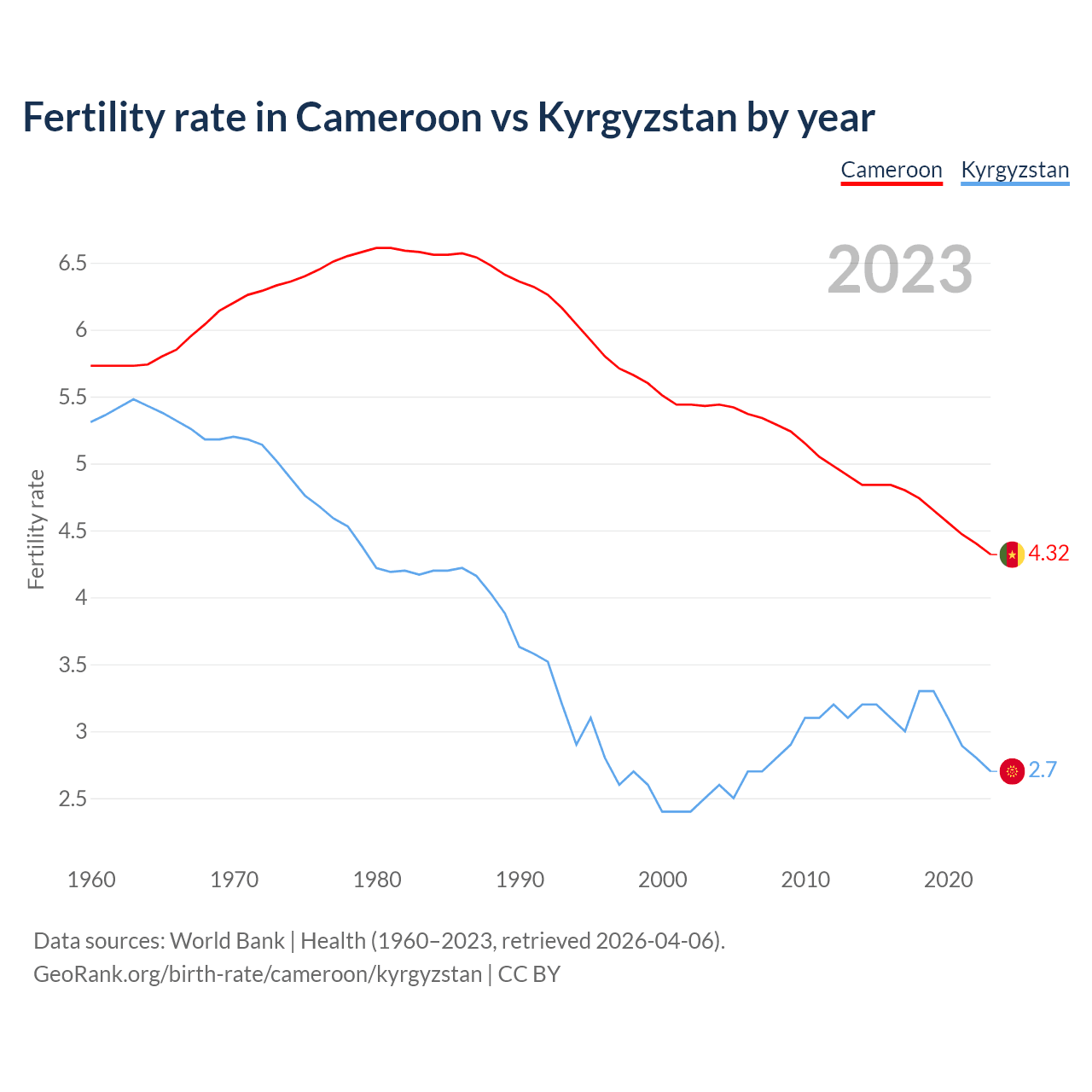1960 vs 2023, the fertility rate has decreased by 24.5% in Cameroon and by 49.1% in Kyrgyzstan — in 1960, it was 5.73 and 5.31, respectively.