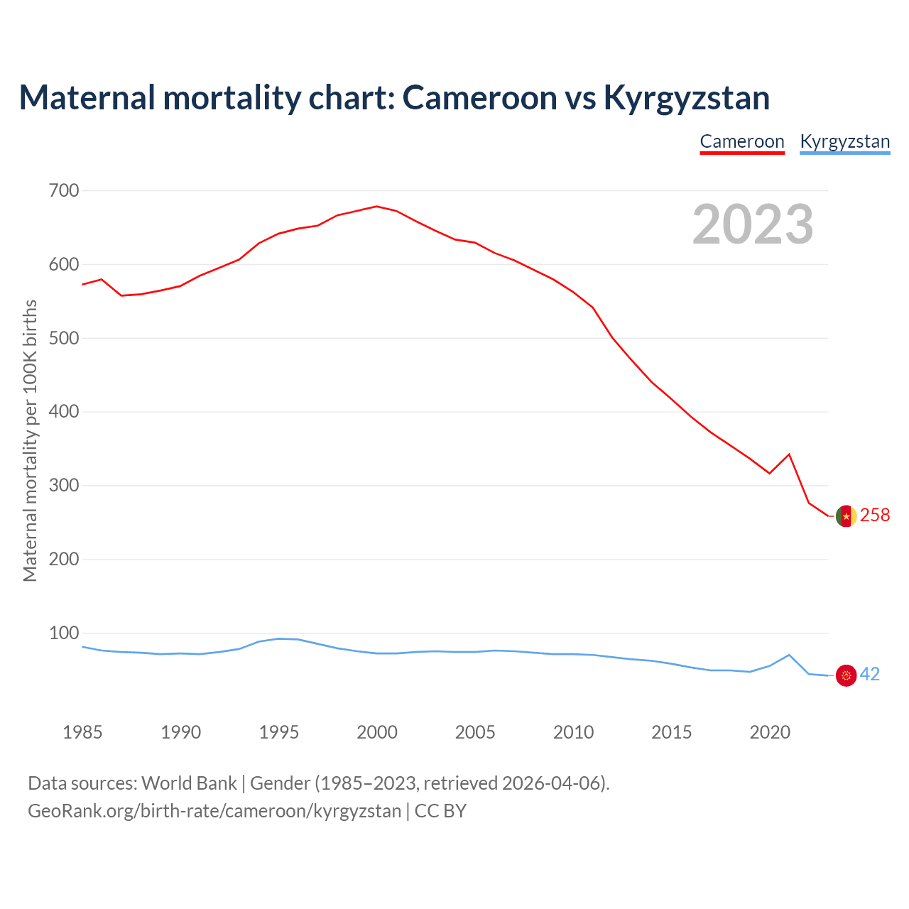 The maternal mortality rate, which is the probability of dying during childbirth or within 42 days of pregnancy termination, is 258 deaths per 100,000 live births in Cameroon, compared to 42 deaths in Kyrgyzstan.