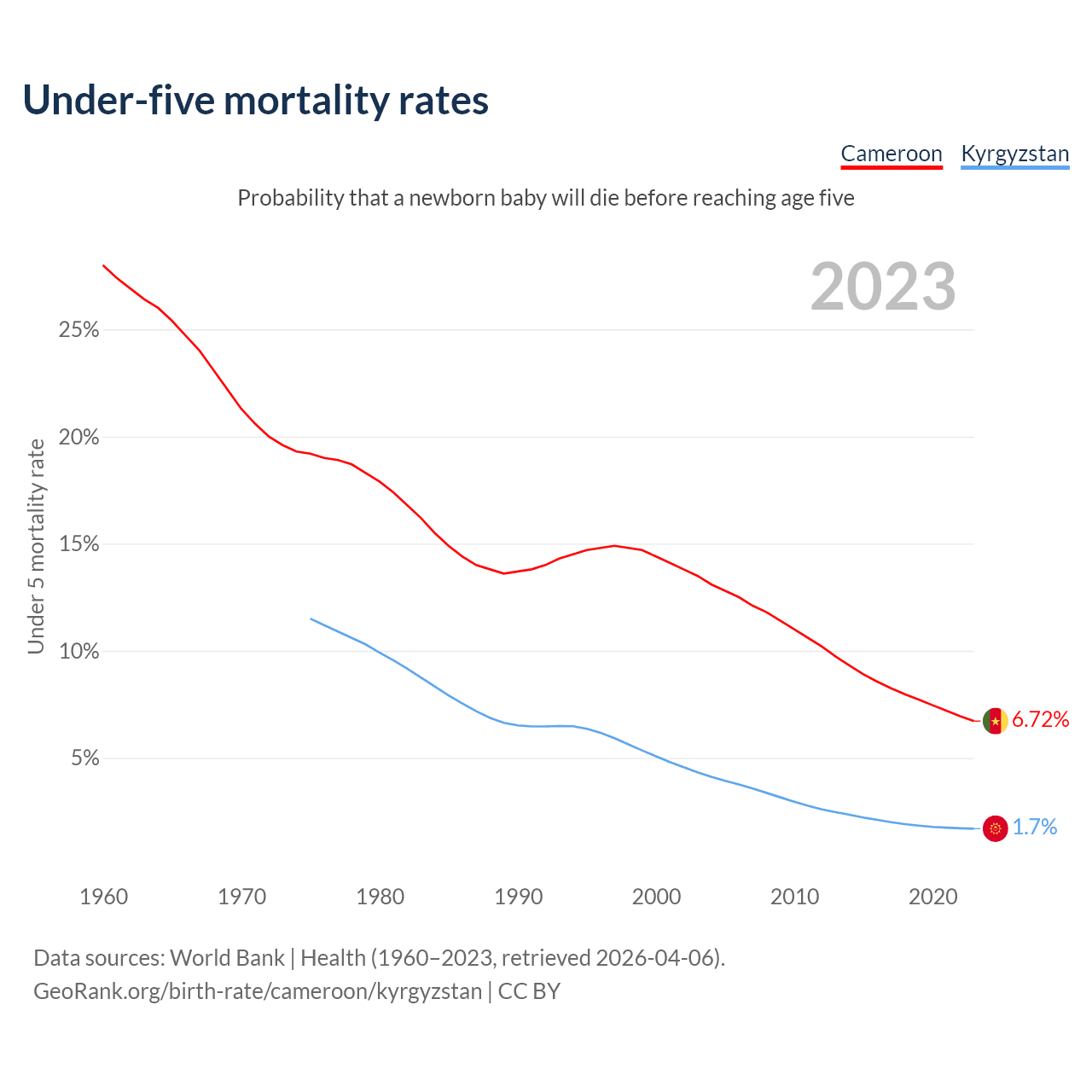 The chance that a newborn baby will die before reaching age five is 6.72% in Cameroon and 1.7% in Kyrgyzstan. Above is a chart with historical data on under-five mortality rates.