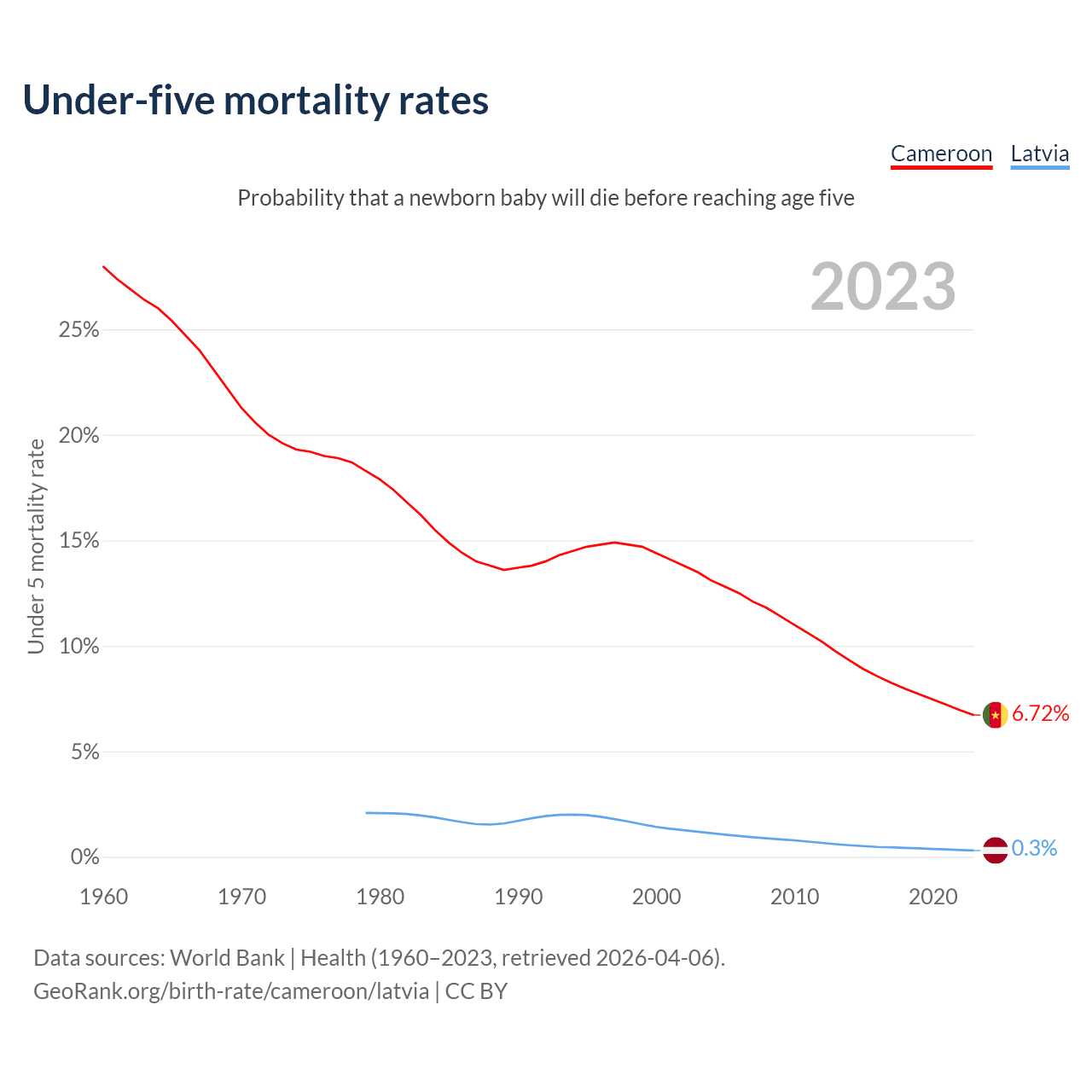 The chance that a newborn baby will die before reaching age five is 6.72% in Cameroon and 0.3% in Latvia. Above is a chart with historical data on under-five mortality rates.