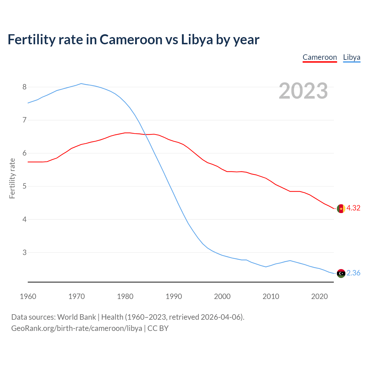 1960 vs 2023, the fertility rate has decreased by 24.5% in Cameroon and by 68.6% in Libya — in 1960, it was 5.73 and 7.51, respectively.