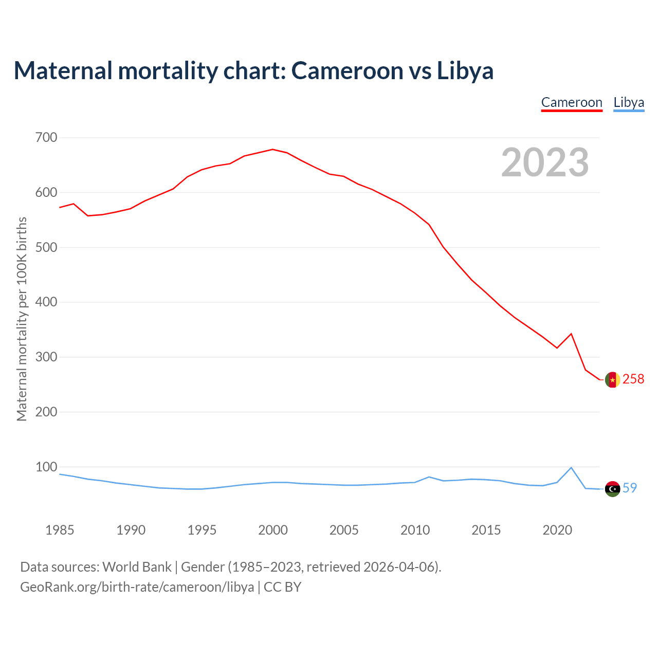 The maternal mortality rate, which is the probability of dying during childbirth or within 42 days of pregnancy termination, is 258 deaths per 100,000 live births in Cameroon, compared to 59 deaths in Libya.