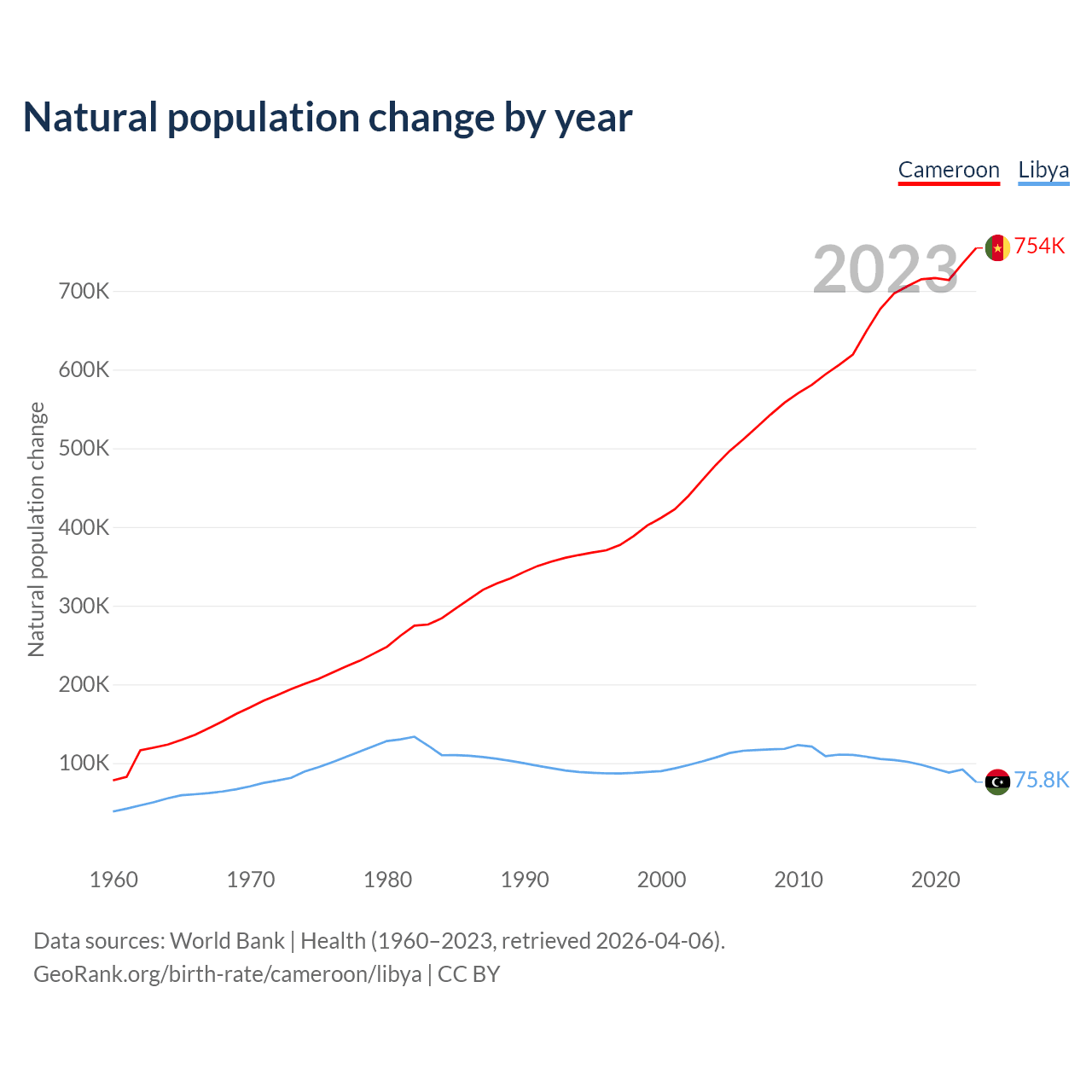 According to the latest available data on birth rates, the fertility rate in Cameroon was 4.32 children per woman in 2023, compared to 2.36 in Libya in 2023. The replacement level is considered to be 2.1 children per woman.