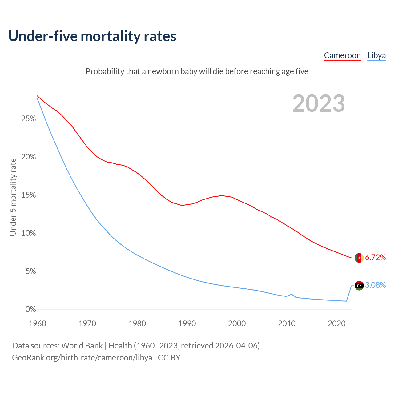 The chance that a newborn baby will die before reaching age five is 6.72% in Cameroon and 3.08% in Libya. Above is a chart with historical data on under-five mortality rates.