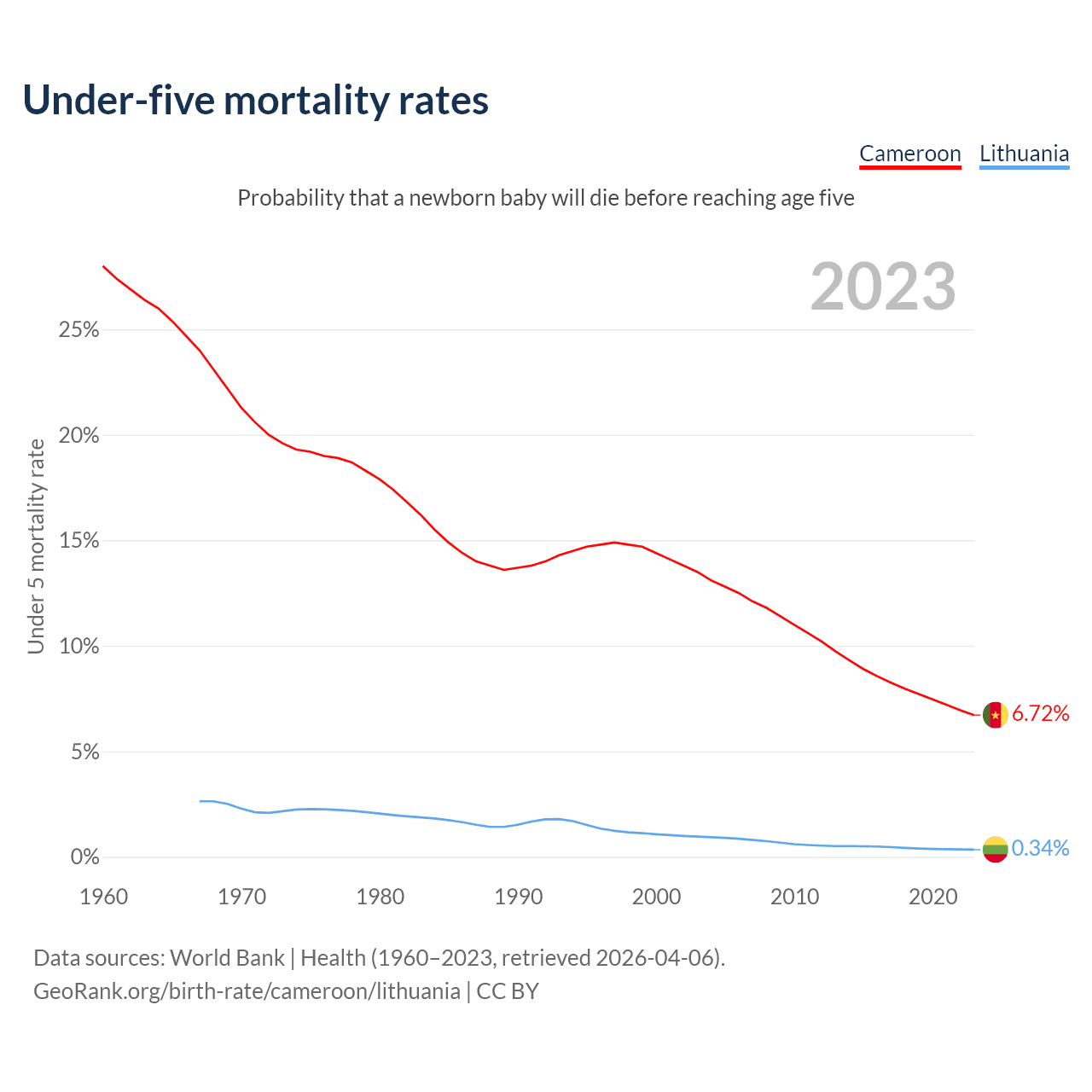 The chance that a newborn baby will die before reaching age five is 6.72% in Cameroon and 0.34% in Lithuania. Above is a chart with historical data on under-five mortality rates.