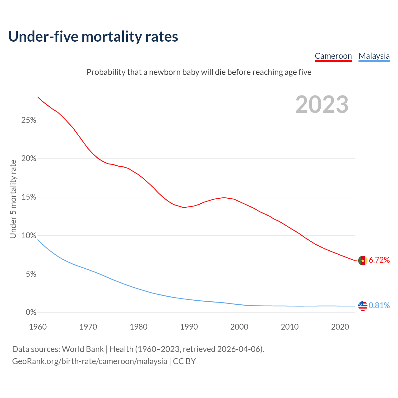 The chance that a newborn baby will die before reaching age five is 6.72% in Cameroon and 0.81% in Malaysia. Above is a chart with historical data on under-five mortality rates.