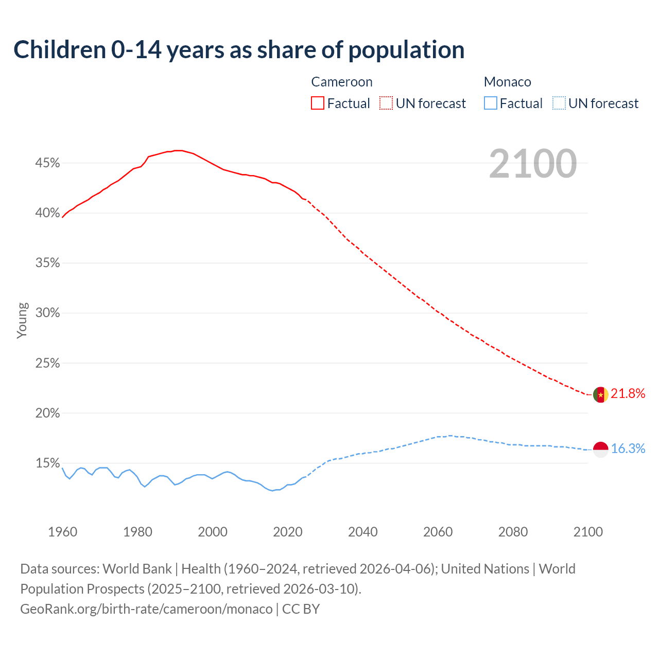 According to the latest available data on birth rates, the fertility rate in Cameroon was 4.32 children per woman in 2023, compared to 2.11 in Monaco in 2023. The replacement level is considered to be 2.1 children per woman.