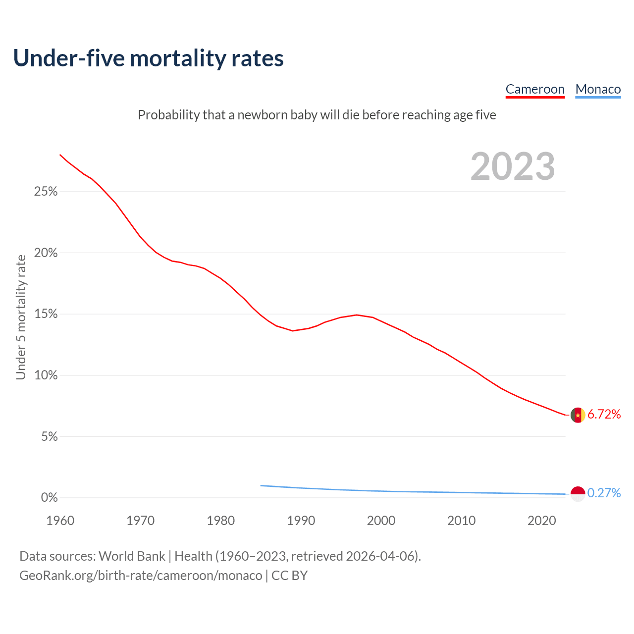 The chance that a newborn baby will die before reaching age five is 6.72% in Cameroon and 0.27% in Monaco. Above is a chart with historical data on under-five mortality rates.