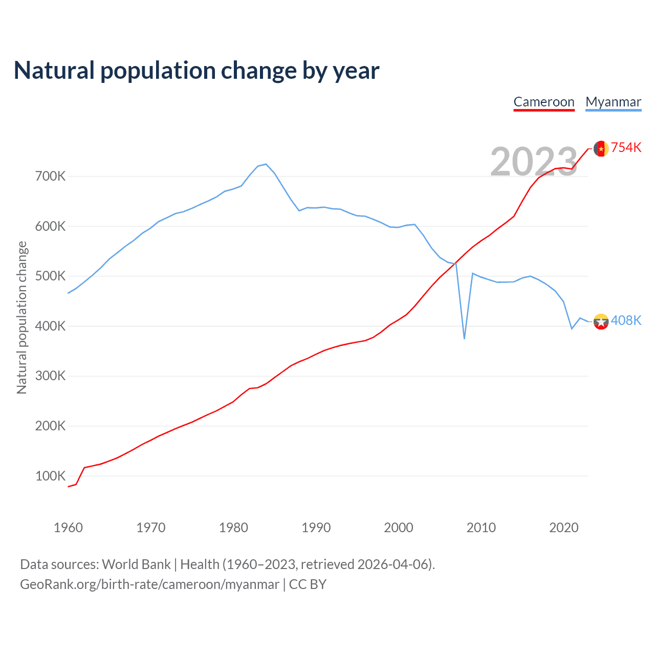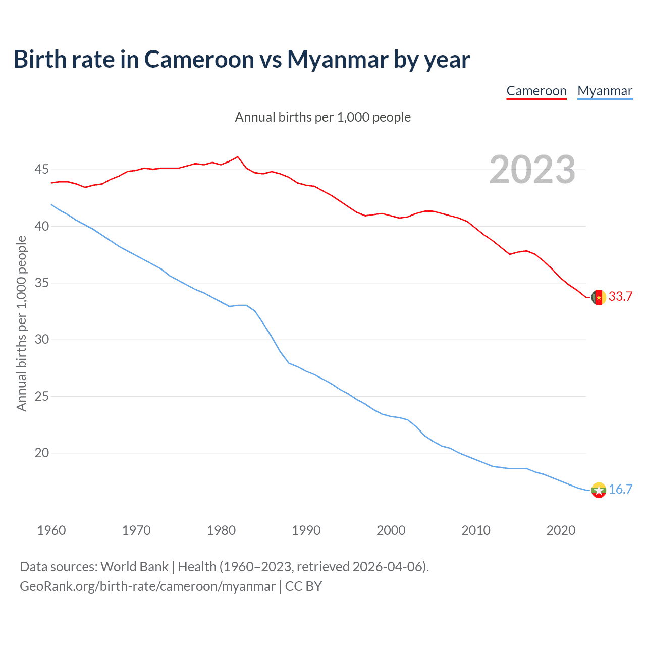 Cameroon has an annual birth rate of 33.7 births per 1,000 people, compared to 16.7 for Myanmar. The average number of children a woman is expected to have during her lifetime — the fertility rate, is 4.32 in Cameroon and 2.12 in Myanmar — 51.1% difference.