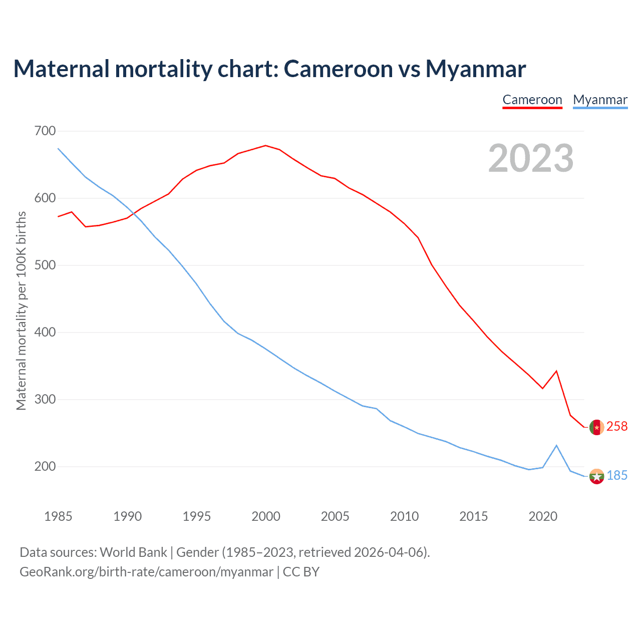 The maternal mortality rate, which is the probability of dying during childbirth or within 42 days of pregnancy termination, is 258 deaths per 100,000 live births in Cameroon, compared to 185 deaths in Myanmar.