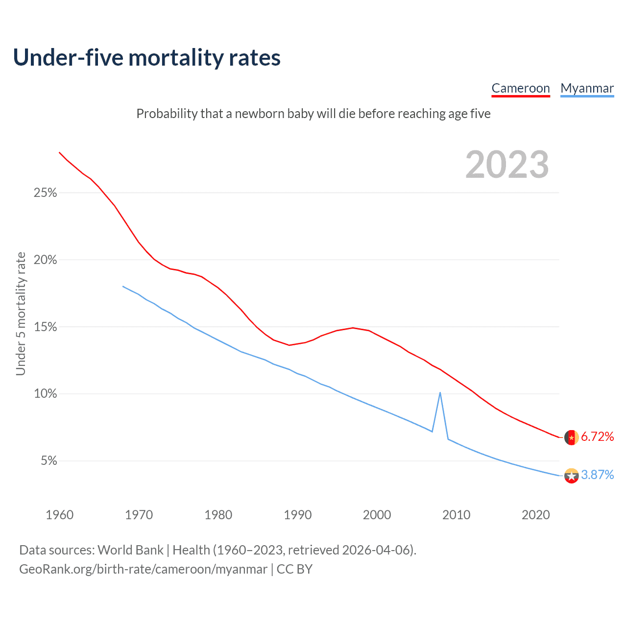 The chance that a newborn baby will die before reaching age five is 6.72% in Cameroon and 3.87% in Myanmar. Above is a chart with historical data on under-five mortality rates.