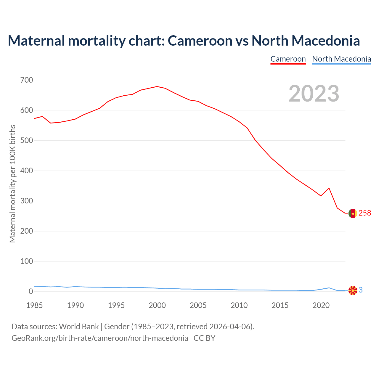 The maternal mortality rate, which is the probability of dying during childbirth or within 42 days of pregnancy termination, is 258 deaths per 100,000 live births in Cameroon, compared to 3 deaths in North Macedonia.