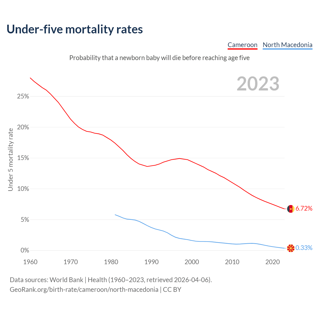 The chance that a newborn baby will die before reaching age five is 6.72% in Cameroon and 0.33% in North Macedonia. Above is a chart with historical data on under-five mortality rates.