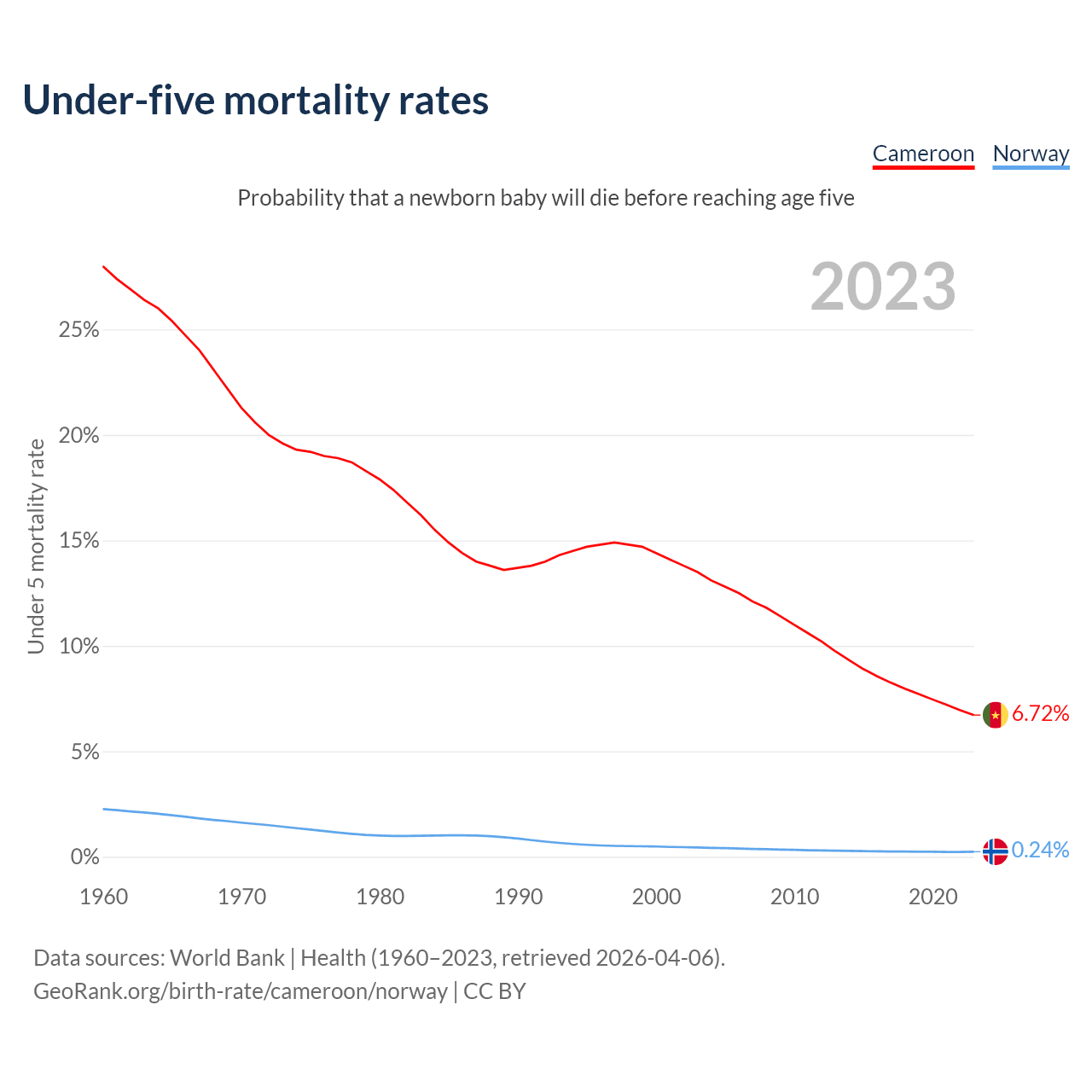 The chance that a newborn baby will die before reaching age five is 6.72% in Cameroon and 0.24% in Norway. Above is a chart with historical data on under-five mortality rates.