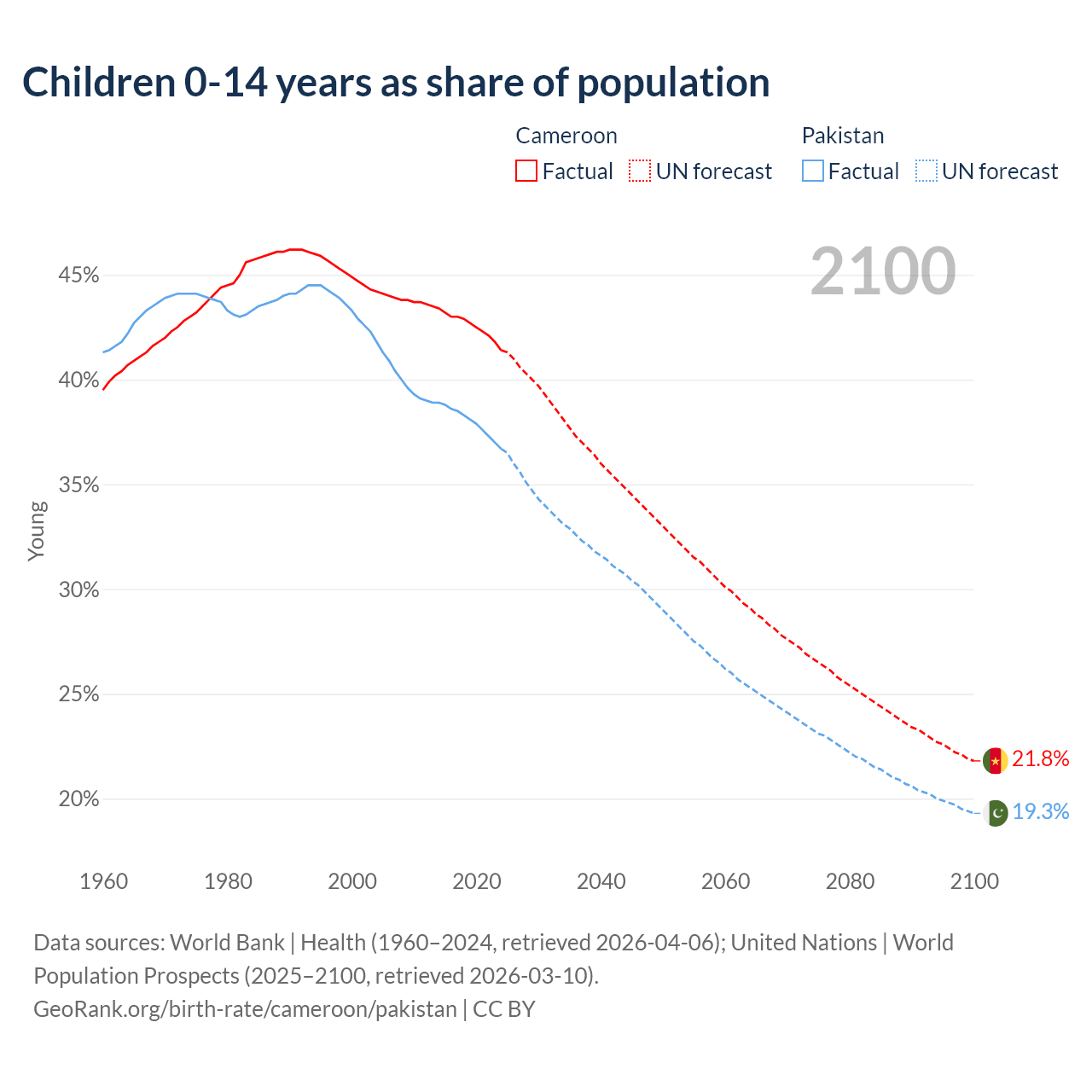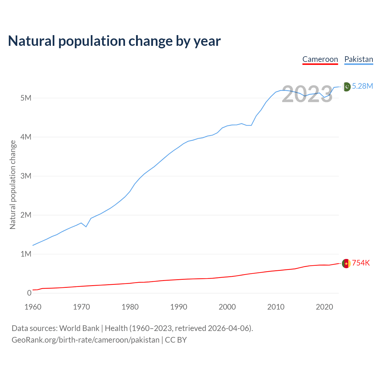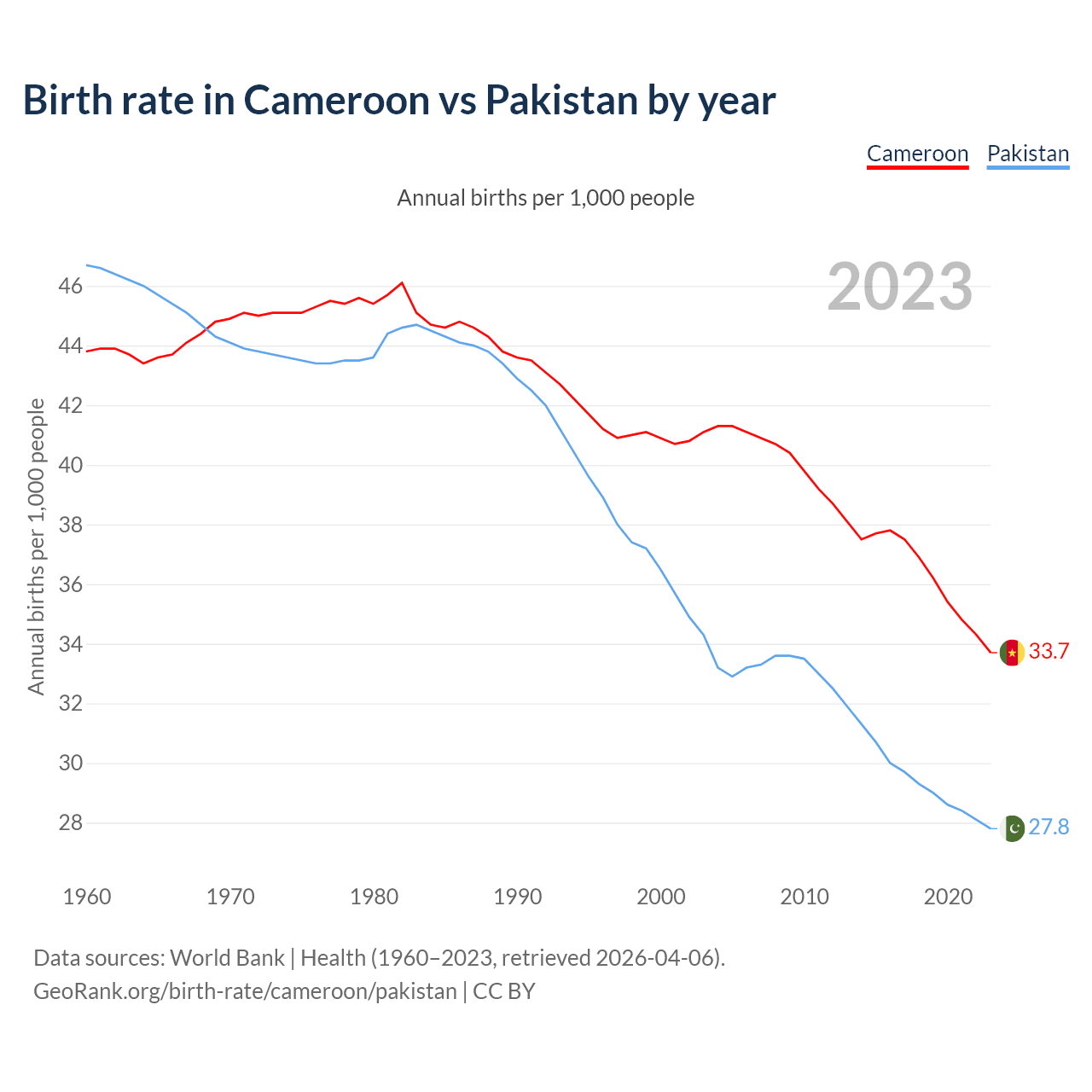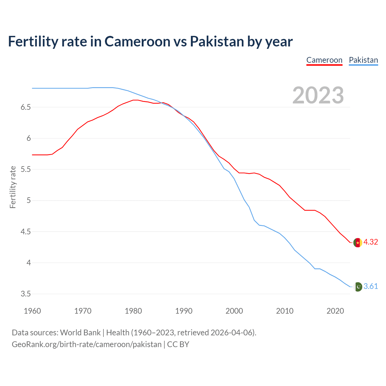 According to the latest available data on birth rates, the fertility rate in Cameroon was 4.32 children per woman in 2023, compared to 3.61 in Pakistan in 2023. The replacement level is considered to be 2.1 children per woman.