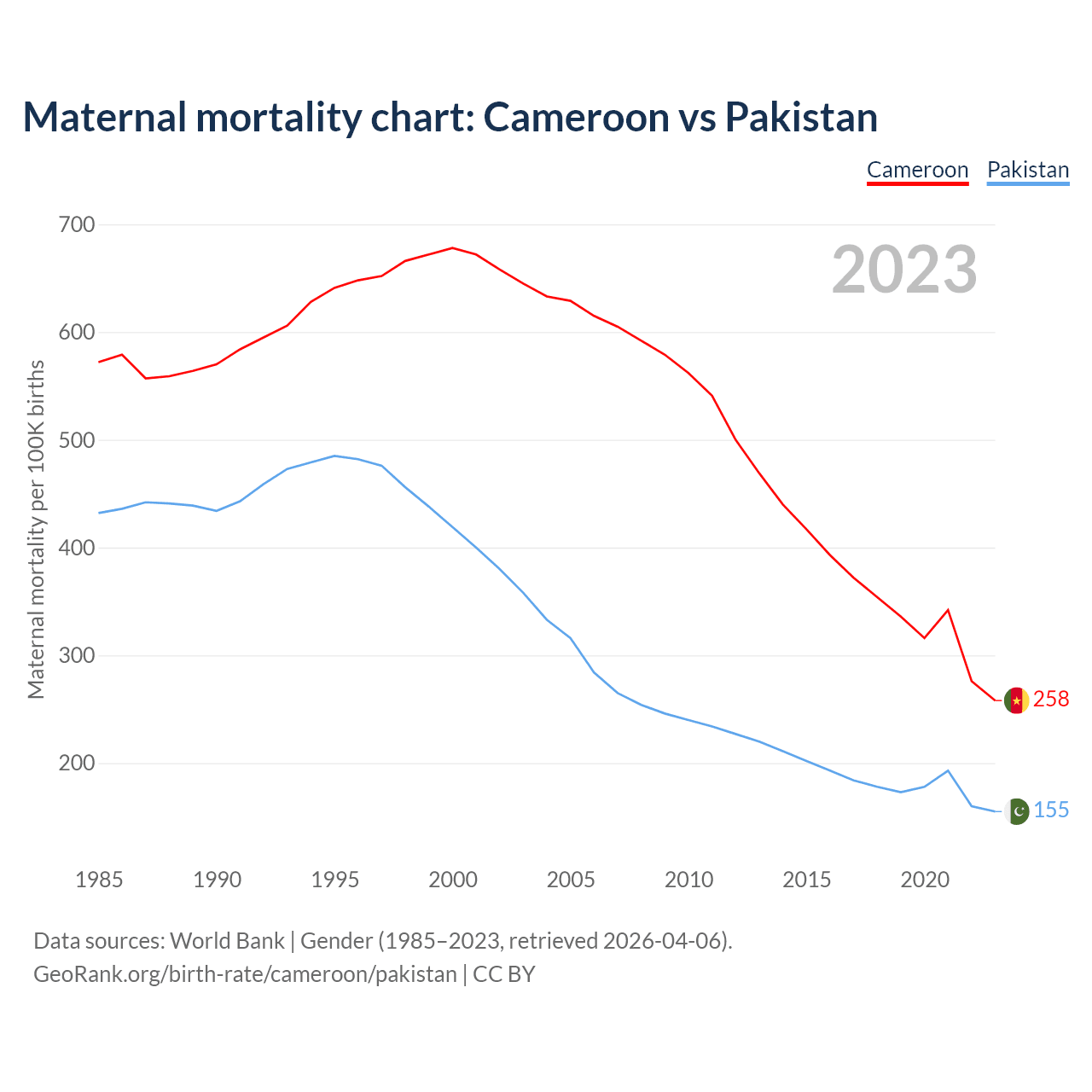 The maternal mortality rate, which is the probability of dying during childbirth or within 42 days of pregnancy termination, is 258 deaths per 100,000 live births in Cameroon, compared to 155 deaths in Pakistan.
