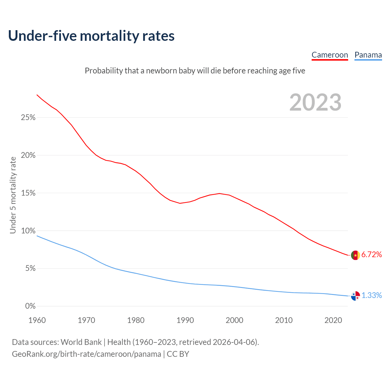 The chance that a newborn baby will die before reaching age five is 6.72% in Cameroon and 1.33% in Panama. Above is a chart with historical data on under-five mortality rates.