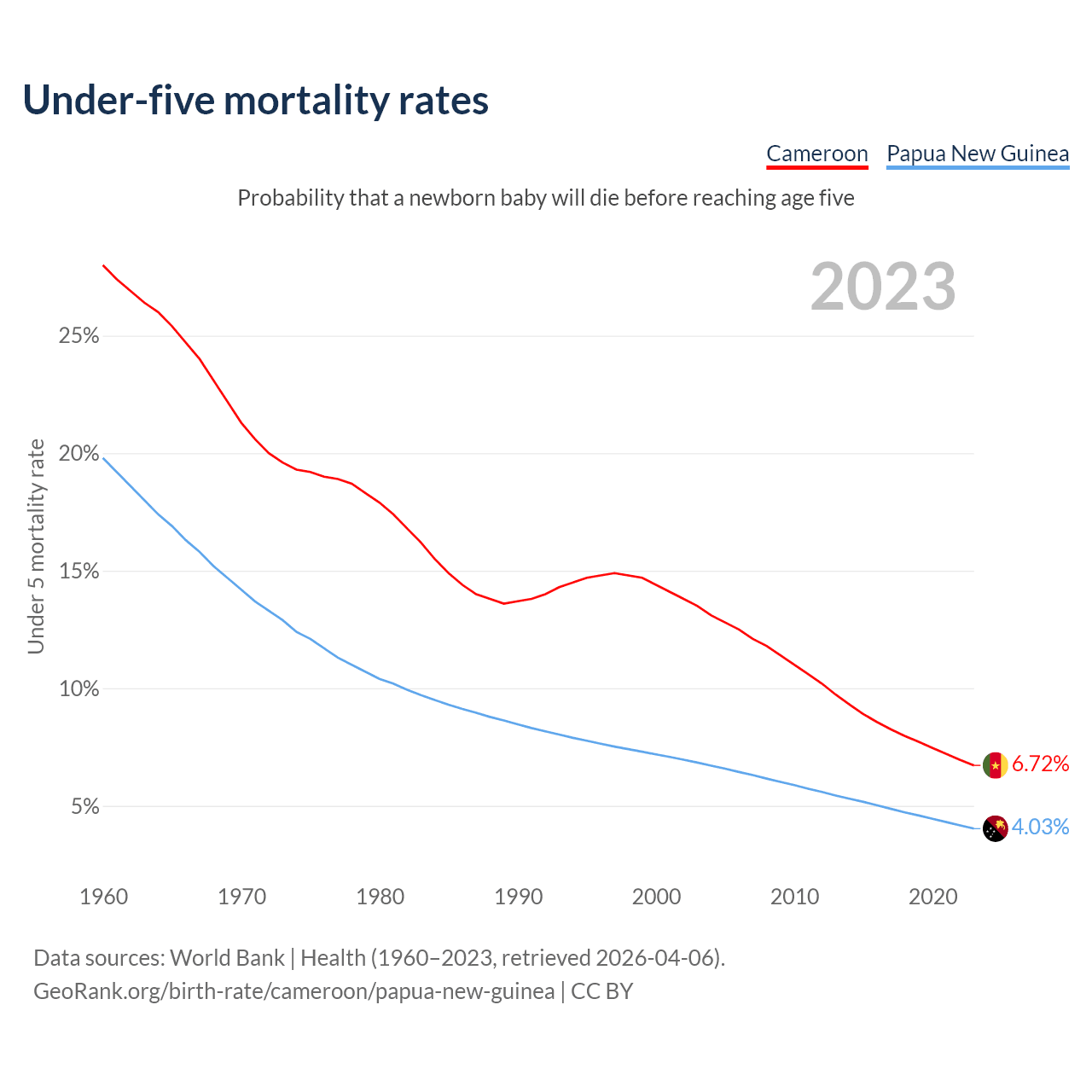 The chance that a newborn baby will die before reaching age five is 6.72% in Cameroon and 4.03% in Papua New Guinea. Above is a chart with historical data on under-five mortality rates.