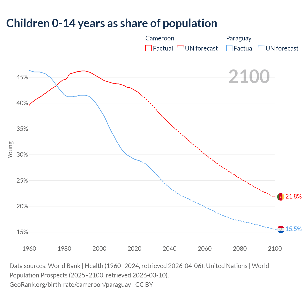 According to the latest available data on birth rates, the fertility rate in Cameroon was 4.32 children per woman in 2023, compared to 2.42 in Paraguay in 2023. The replacement level is considered to be 2.1 children per woman.